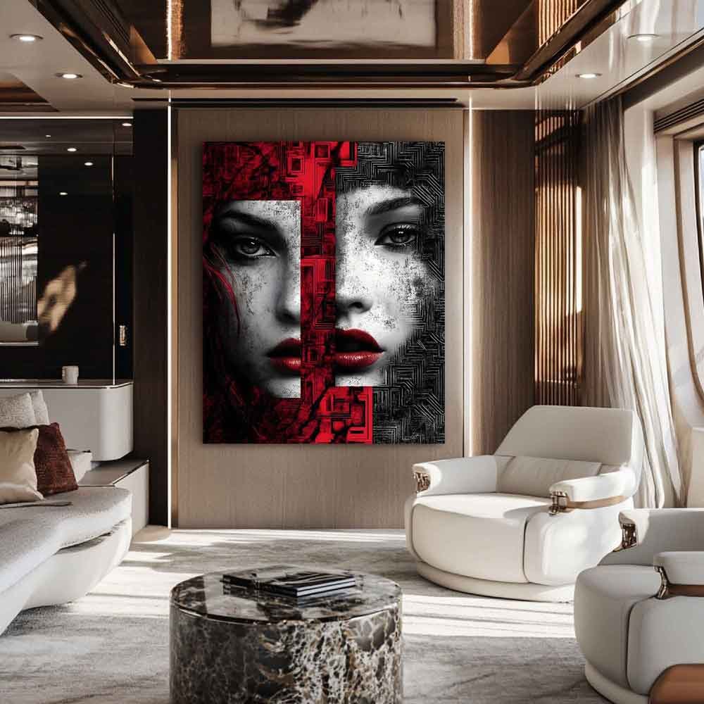 This isn’t just a portrait; it’s a vision of the digital frontier. Featuring a striking, augmented woman whose silhouette is interwoven with glowing red circuit patterns, this artwork captures the essence of a cyberpunk reality. The intentional “glitch art” effects—including digital distortion, chromatic aberration, and fragmented textures—mimic the aesthetic of a high-speed data stream. It is the ultimate statement piece for gamers, tech enthusiasts, and fans of dystopian sci-fi who want their decor to pulse with the energy of a neon-drenched metropolis.