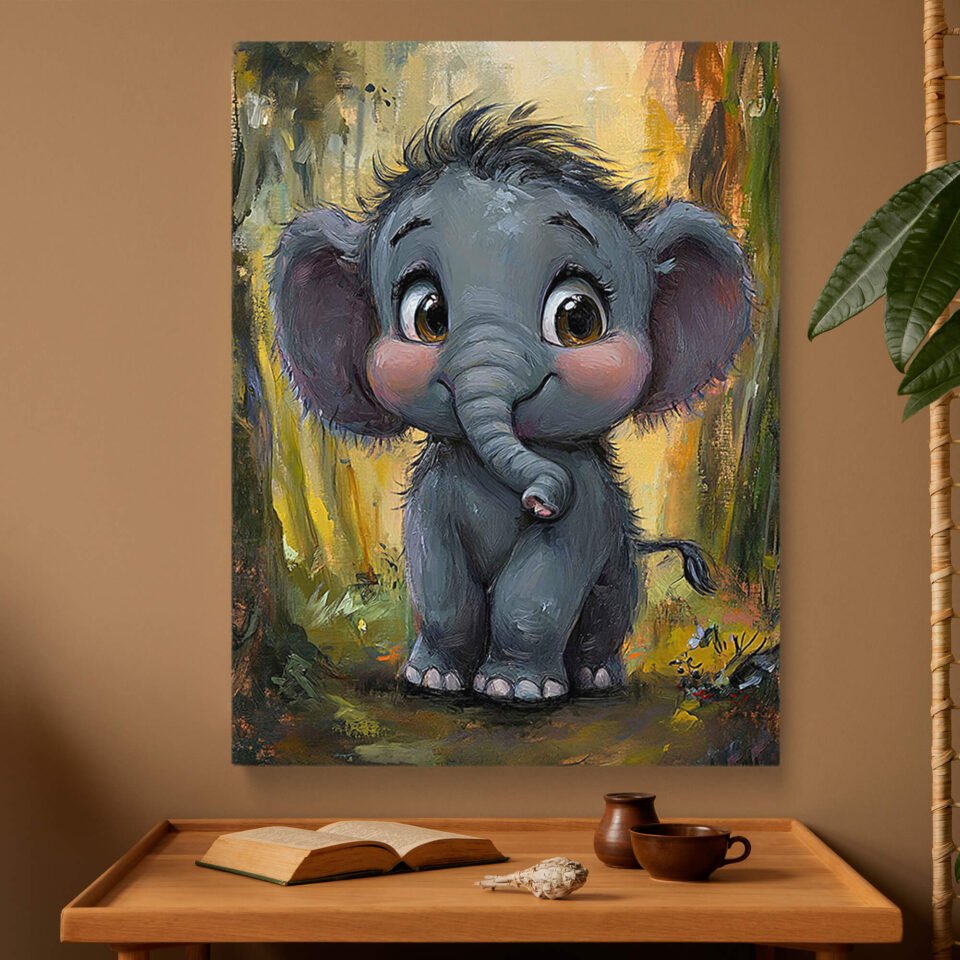 Fluffy Baby Elephant Canvas Print, Big Eyed Jungle Animal Art, Enchanted Forest Nursery Decor