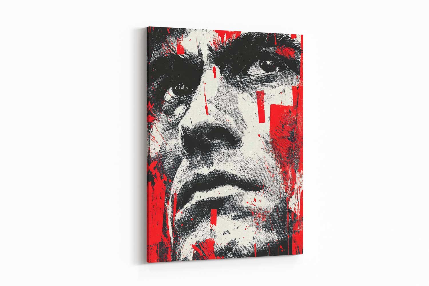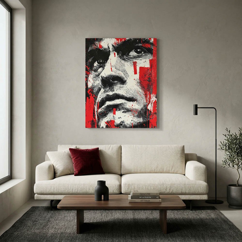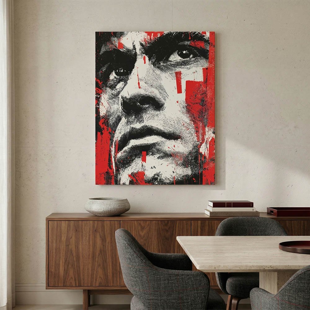 Inject your space with raw, urban energy and uncompromising style with our Abstract Face Canvas Print with Red Paint Splatter. This captivating piece is more than just decor; it’s an industrial style urban decor for man cave or studio that transforms your wall into a dynamic statement, bringing bold graphic appeal and an edgy aesthetic to any room.
