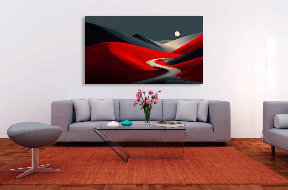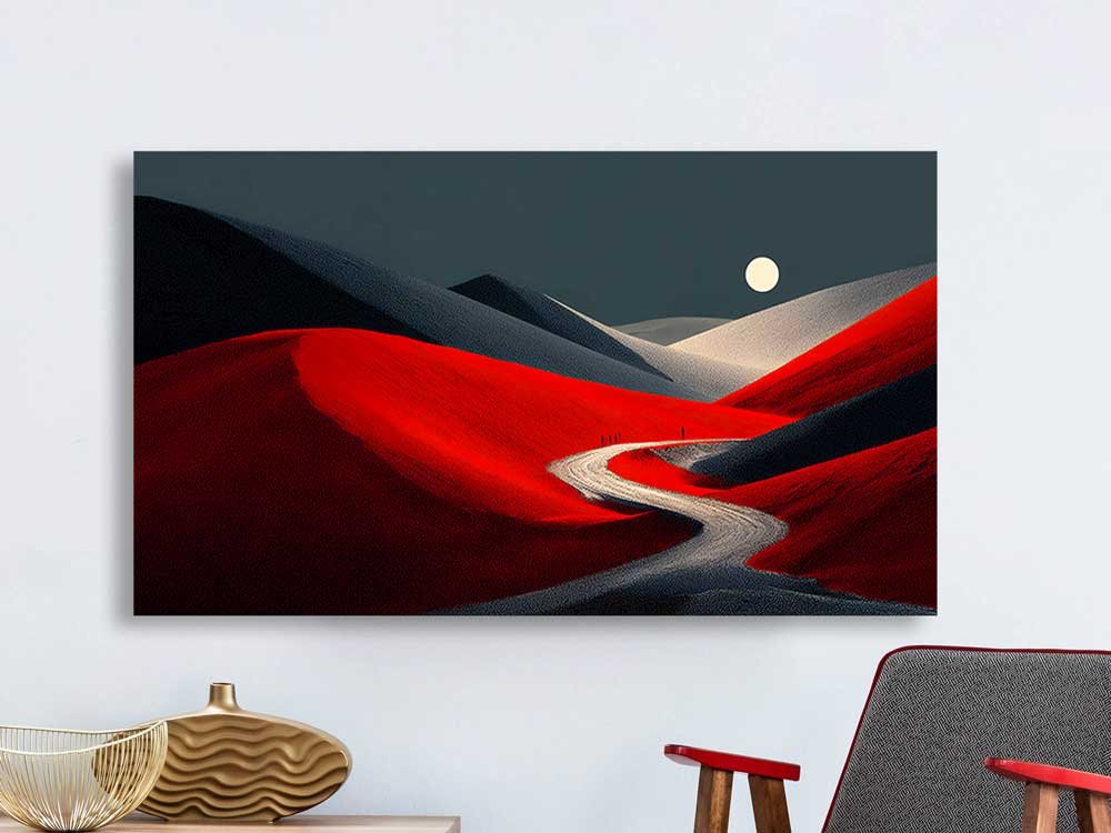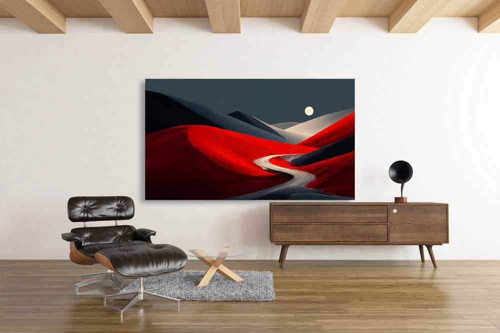 Step into a world where reality meets the celestial. This striking piece features rolling desert dunes in a rich, saturated crimson red, contrasted by a sleek, modern minimalist path that winds toward a glowing lunar horizon. The “Road to the Moon” concept adds a sense of mystery and infinite possibility to your walls, making it more than just decor—it’s a visual narrative.