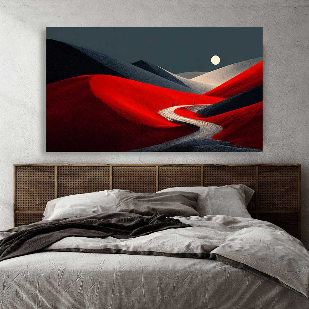 Crimson Desert Dunes Surrealist Wall Art – Wide Horizontal Abstract Landscape Canvas Print – Modern Minimalist Road to the Moon Decor for Living Room