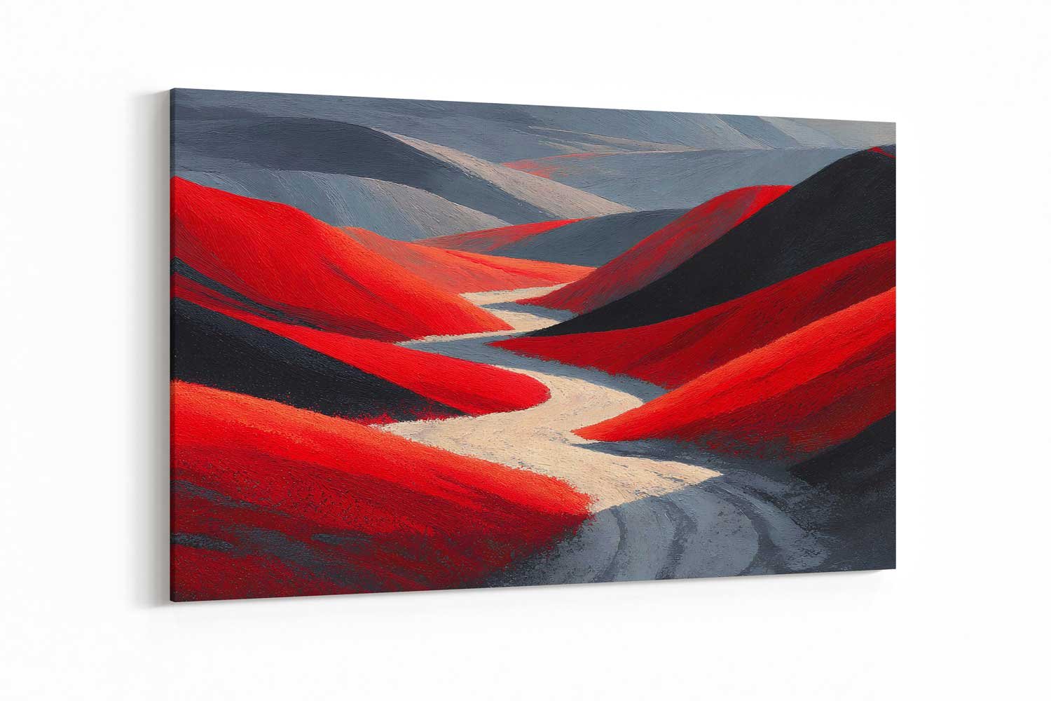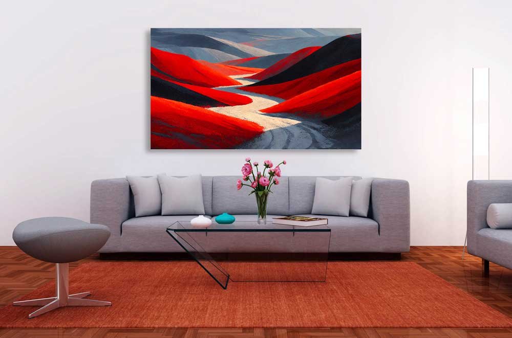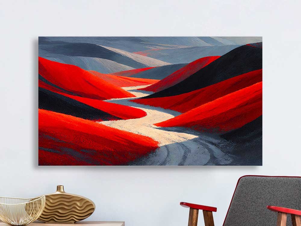 Transform your walls into a gallery of surrealist beauty with our Crimson Impasto Abstract Landscape Wall Art. Featuring a breathtaking panoramic view of a desert hill, this piece combines the raw, tactile energy of palette knife techniques with a sophisticated grey and red colour palette.