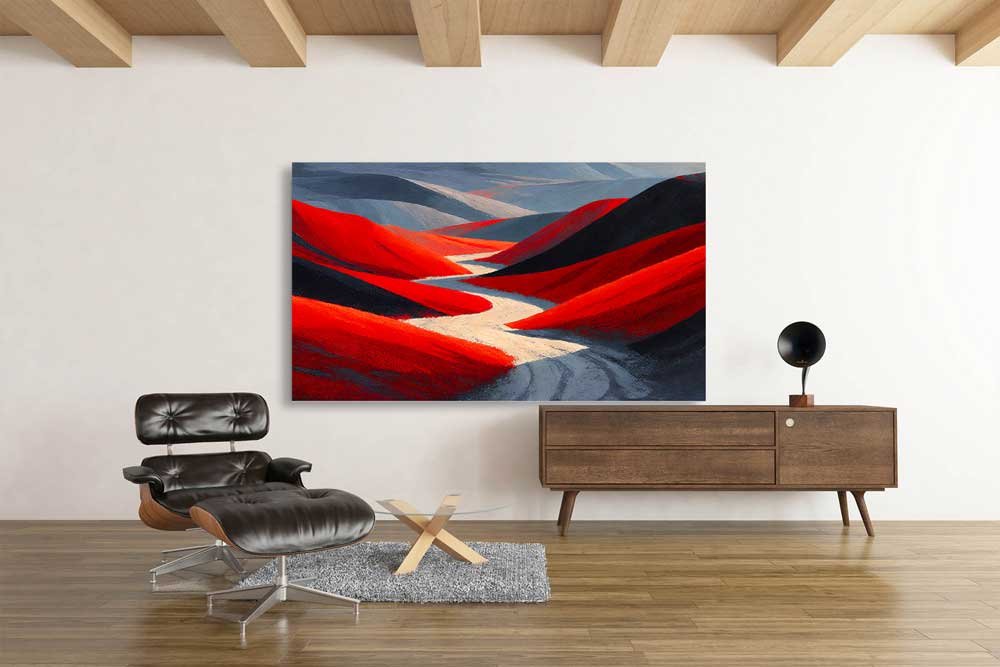 Escape into a world of “Abstract Expressionism” with this stunning desert-inspired masterpiece. The composition features rolling desert hills rendered in deep, fiery crimson reds, contrasted against a moody, atmospheric smoke-grey sky. This surrealist approach turns a traditional landscape into a modern conversation piece, perfect for those who crave art that feels both familiar and otherworldly.