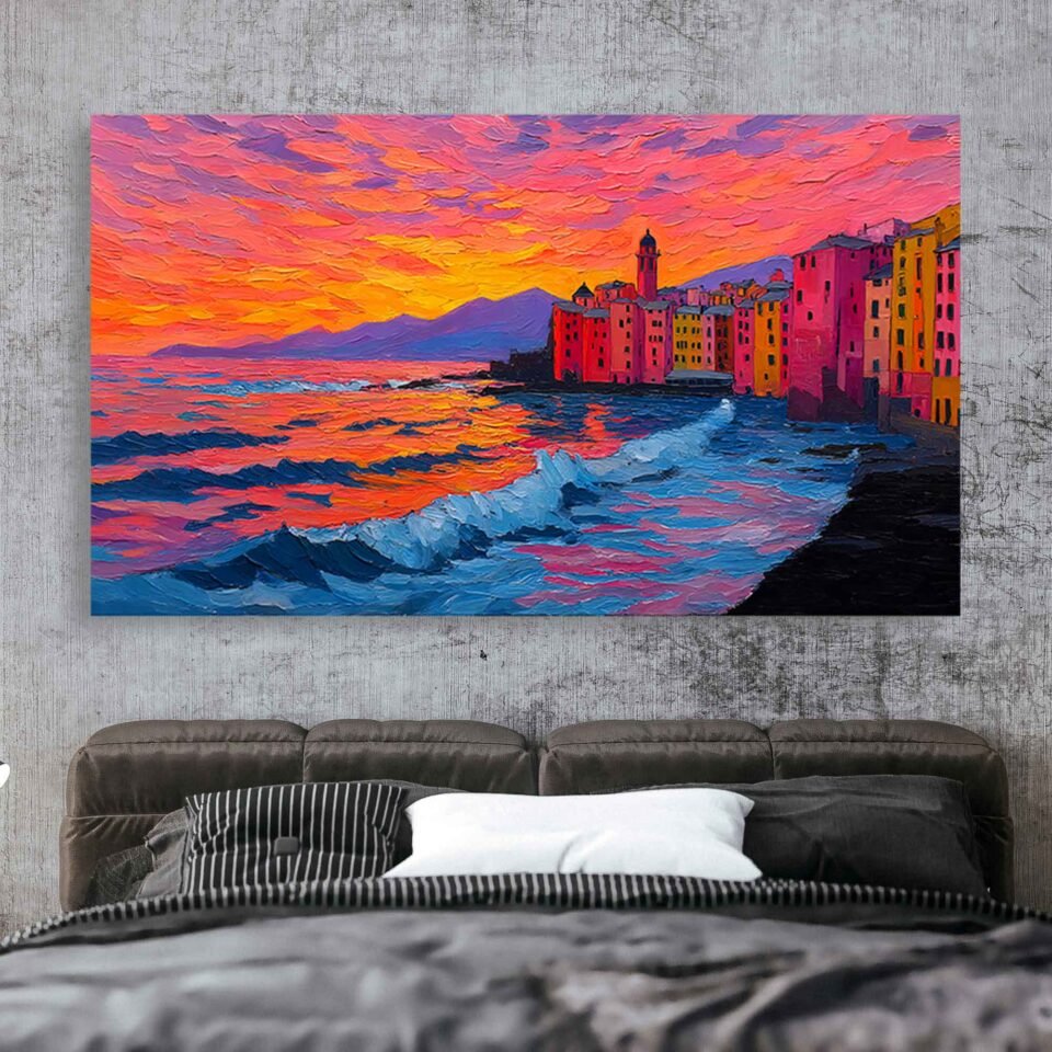 This piece is defined by its extraordinary detail and texture. The high-quality Giclée print masterfully replicates the bold, thick, and expressive strokes of an original Impasto painting. You can almost feel the movement in the Textured Ocean Waves, which crash and foam, mirroring the vibrant chaos of the sky. The colorful buildings of the town, set in deep relief, glow warmly against the turbulent backdrop.