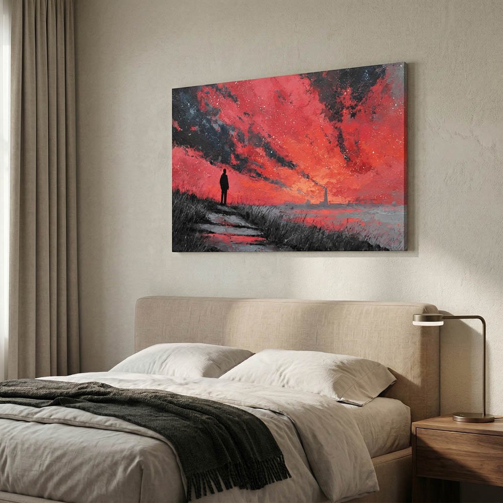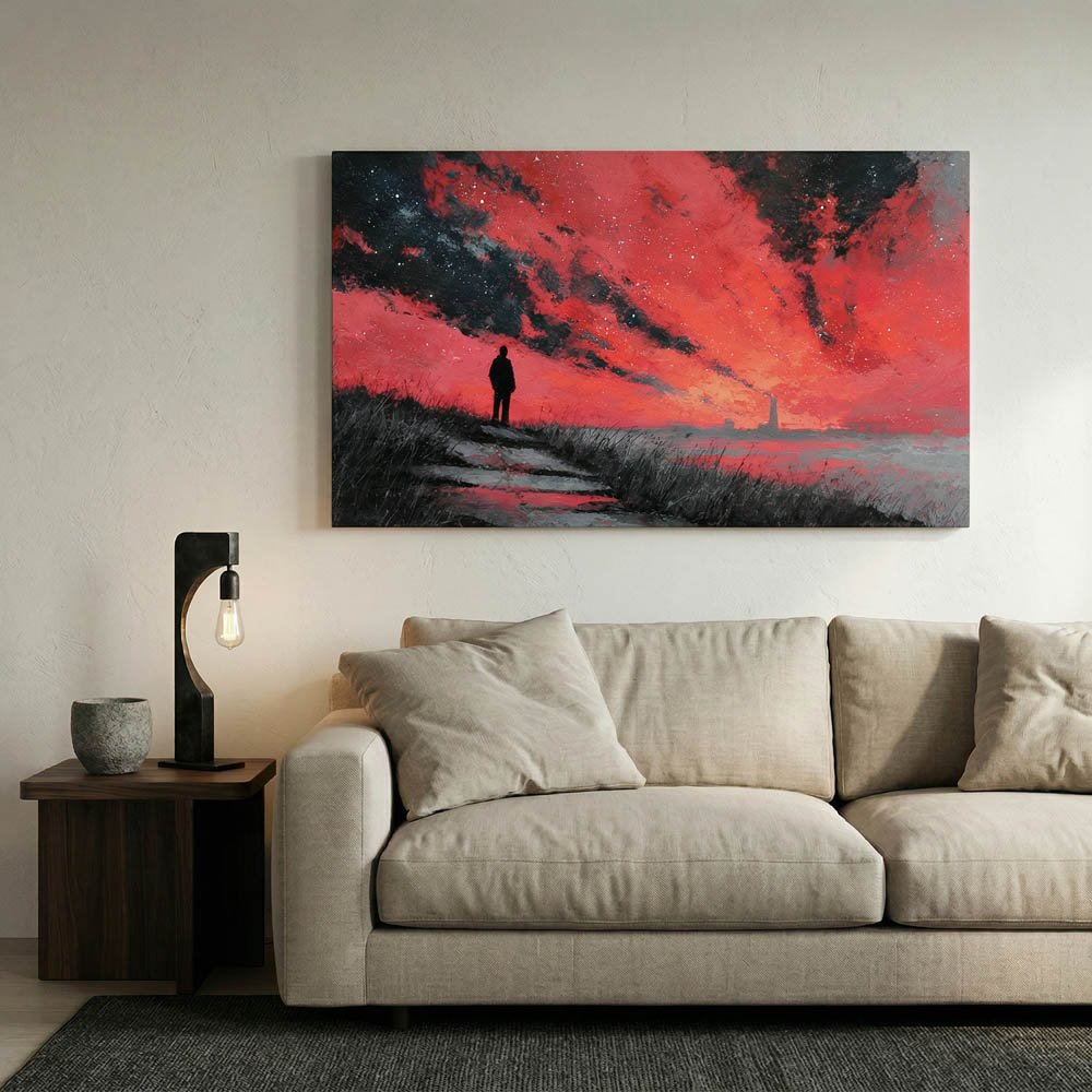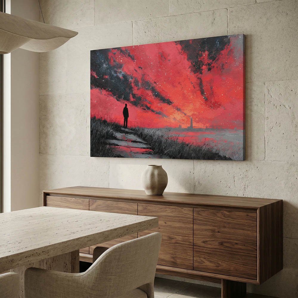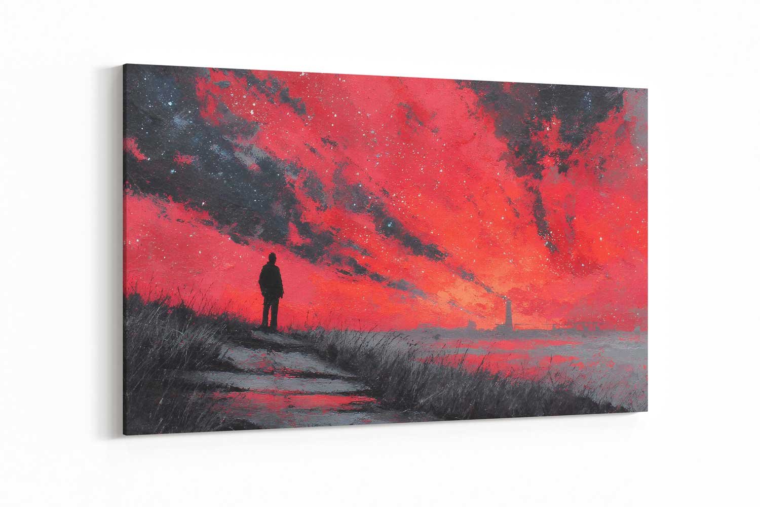 Dystopian Red Sky Wall Art – Cinematic Lone Silhouette Canvas Print – Surreal Industrial Sunset Artwork for Modern Office or Game Room