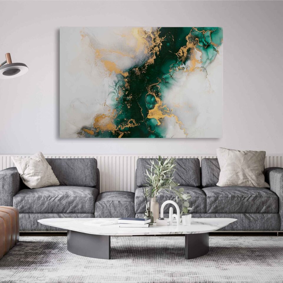 Bring a touch of timeless elegance and modern luxury to your space with our Emerald Green Abstract Framed Art on canvas print. This stunning piece captures the mesmerizing flow of a fluid ink painting, with a dynamic blend of deep emerald green and sparkling gold accents. The subtle textures and intricate patterns create a beautiful, organic feel, reminiscent of polished marble or precious gemstones.