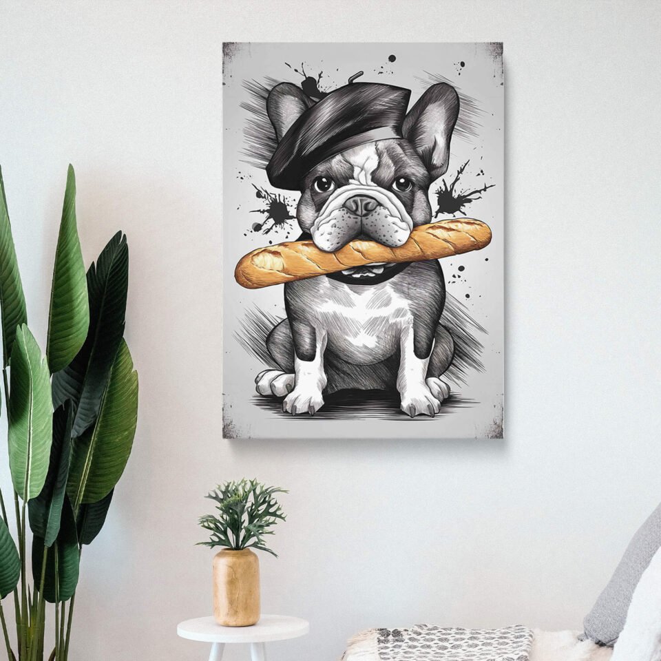 This charming canvas print features a dapper French Bulldog, confidently sporting a classic French beret and holding a freshly baked baguette. The artwork is rendered in a vibrant, contemporary style with bold lines and a pop art aesthetic that makes the image truly pop. This isn’t just a quirky picture; it’s a statement piece that sparks conversation and celebrates the unique character of one of the world’s most beloved breeds. The clever and unexpected juxtaposition of a dog in human attire, combined with a modern art style, makes this a truly one-of-a-kind piece. It’s perfect for adding a sense of humor and modern flair to any space that needs a unique focal point.