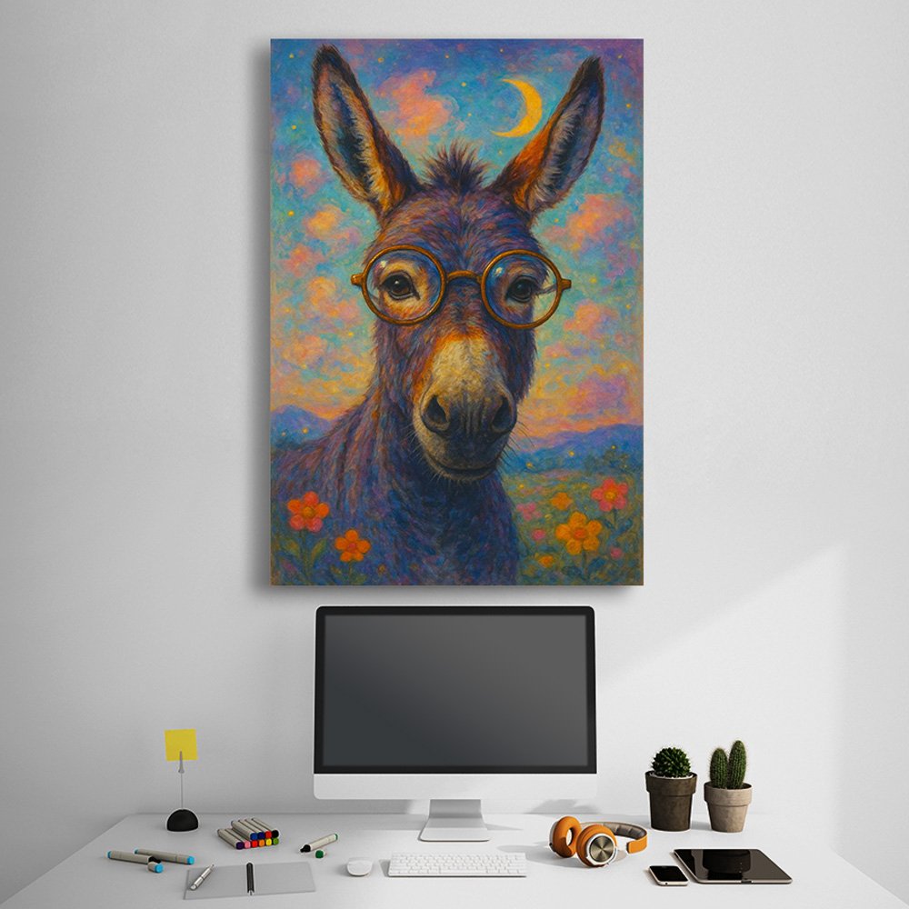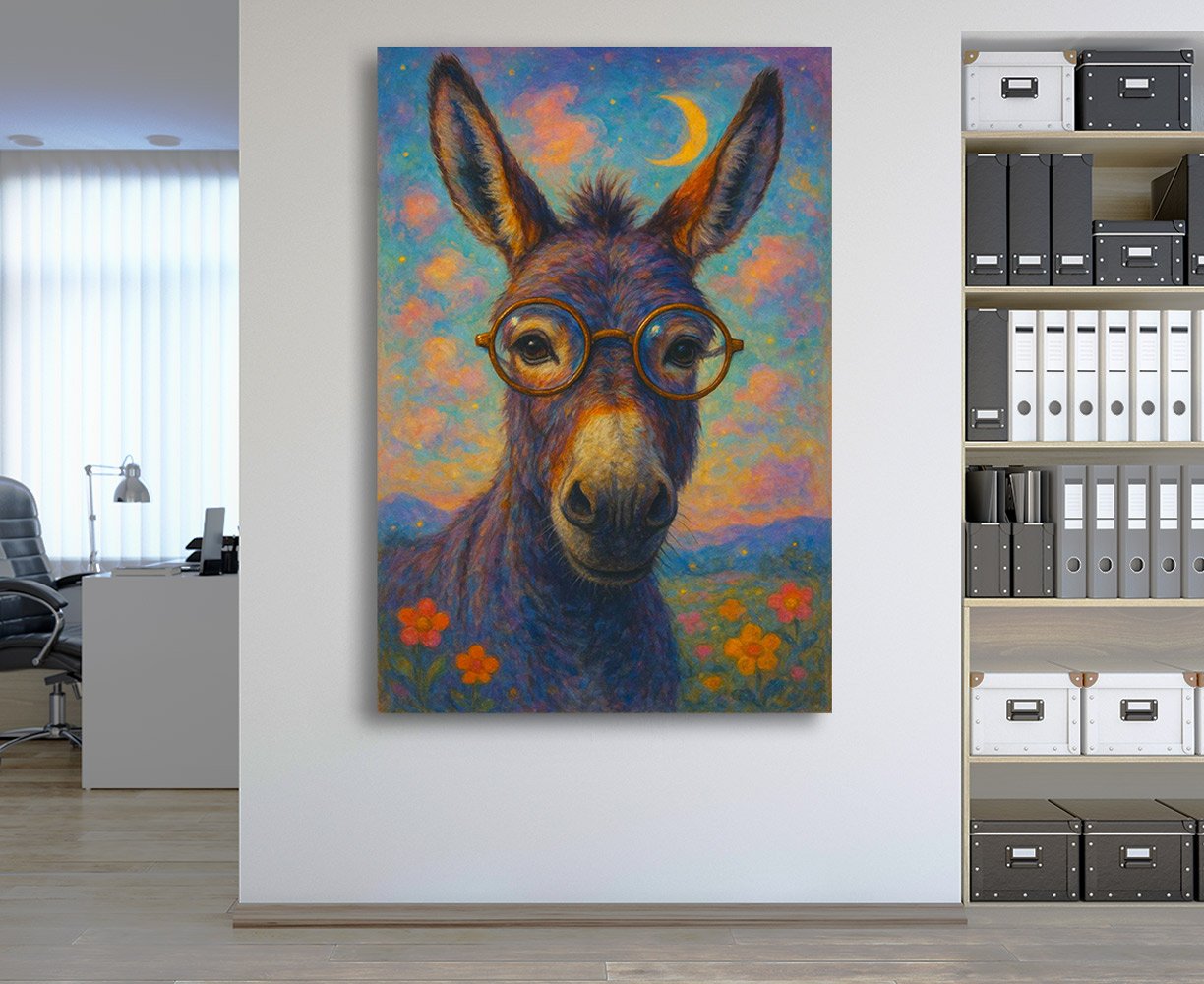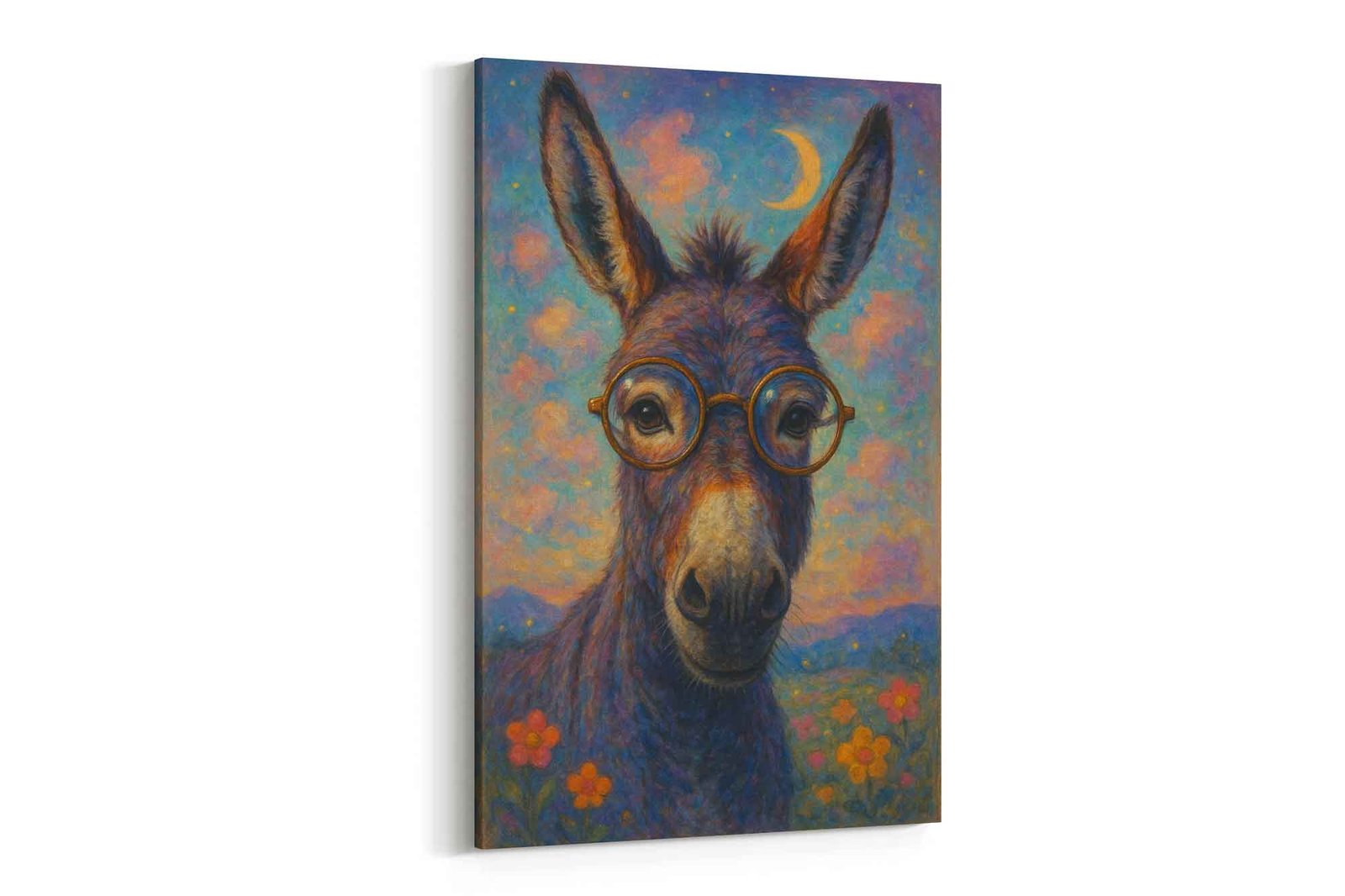 Funny Donkey Wearing Glasses Canvas Print – Whimsical Starry Night Animal Wall Art