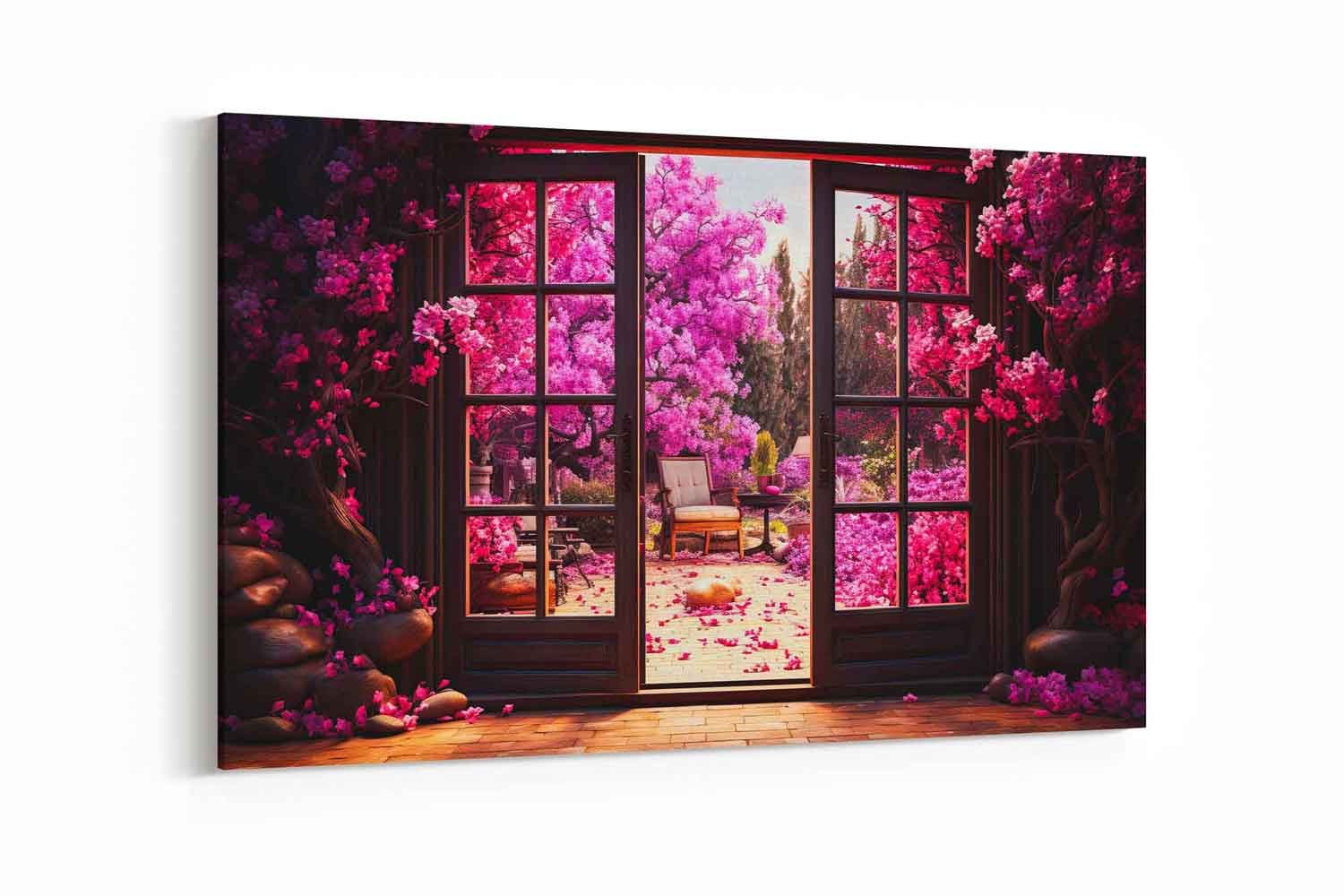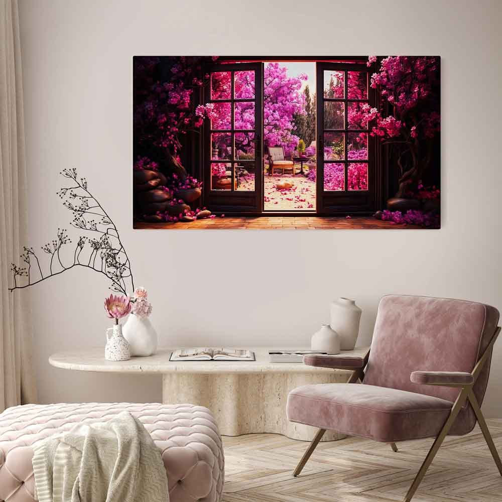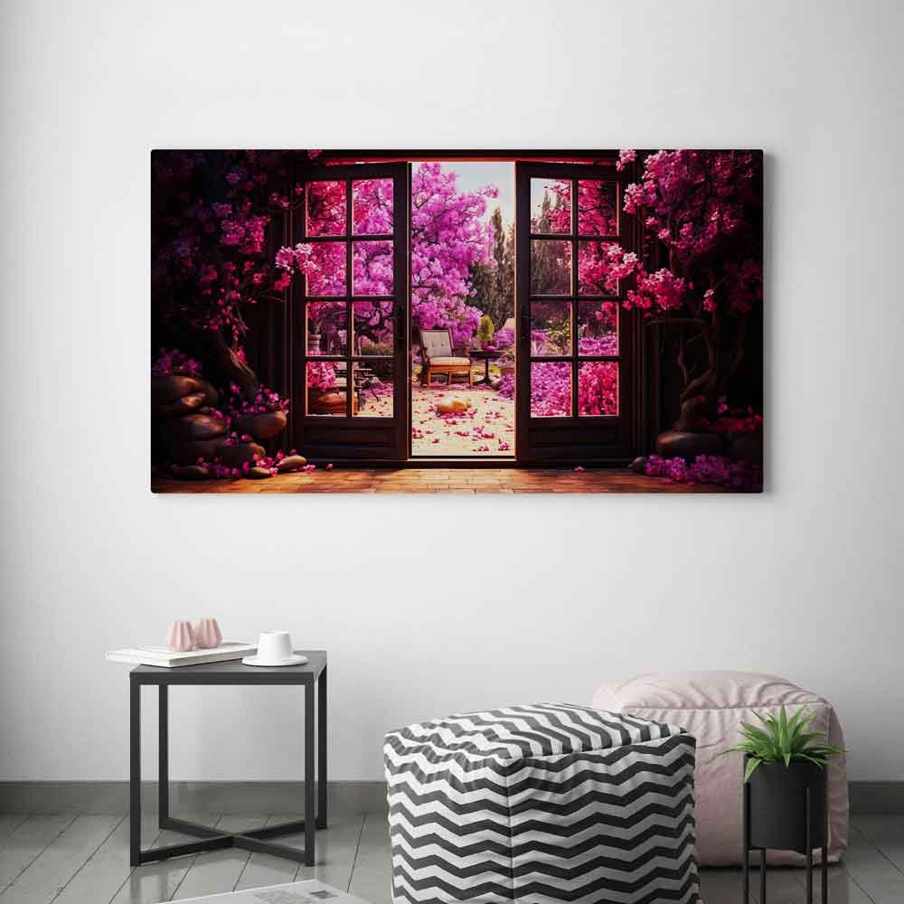 This captivating artwork blends abstract elements with a vibrant scene of a window and door surrounded by flowers, trees, and an imaginative garden. The colorful, fantastical backdrop creates a mesmerising visual, perfect for adding nature’s beauty and abstract allure to your space.