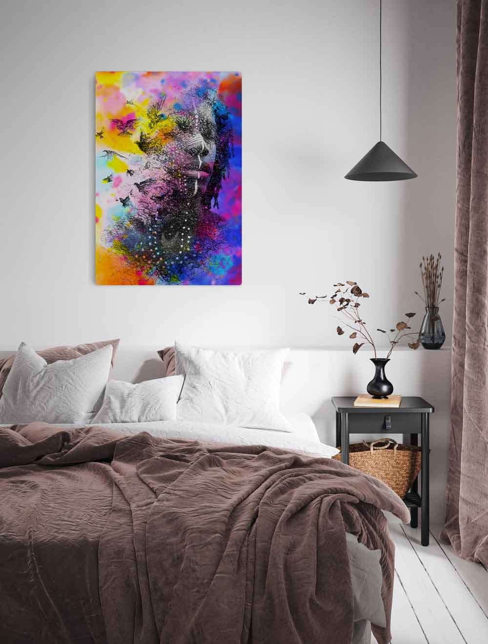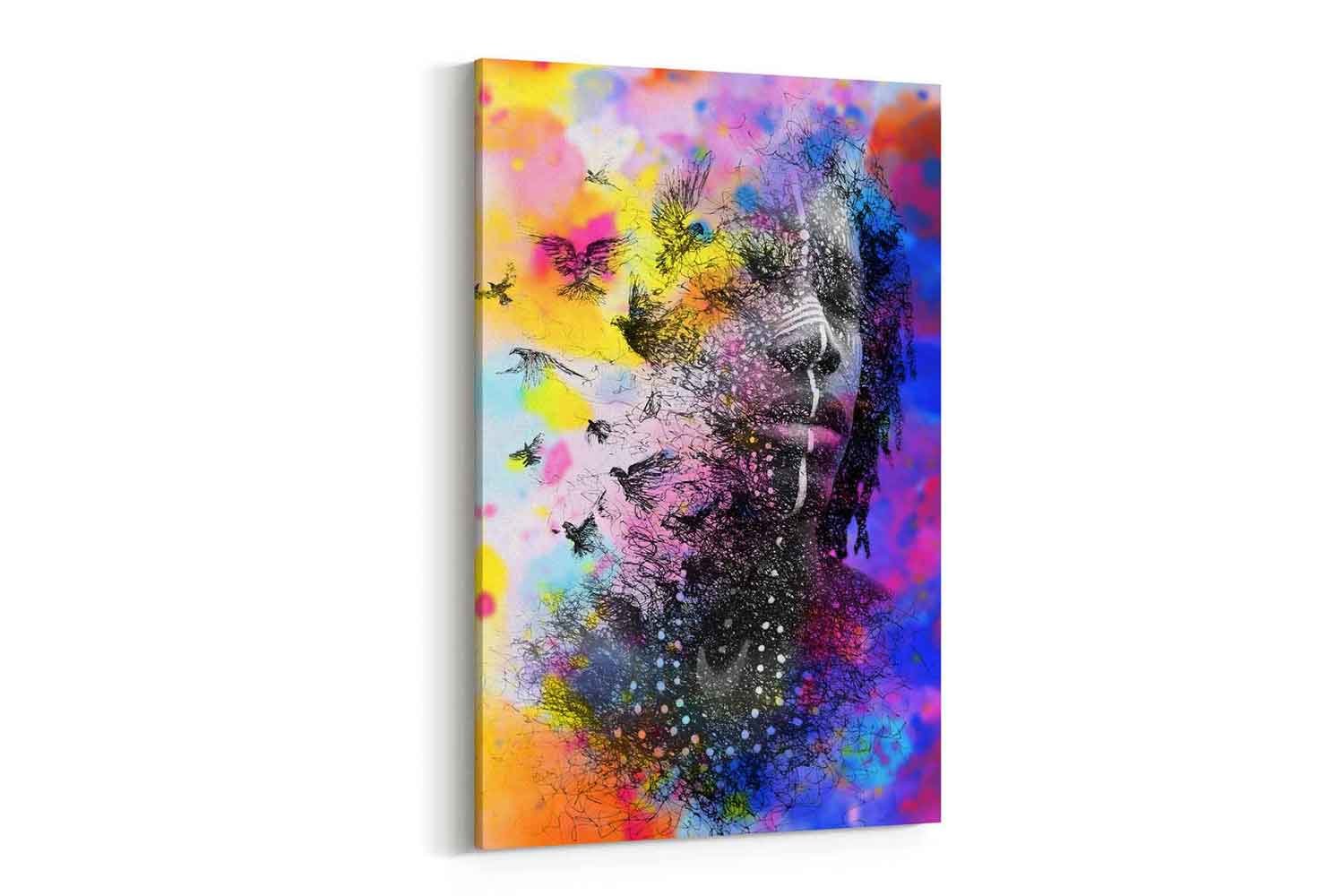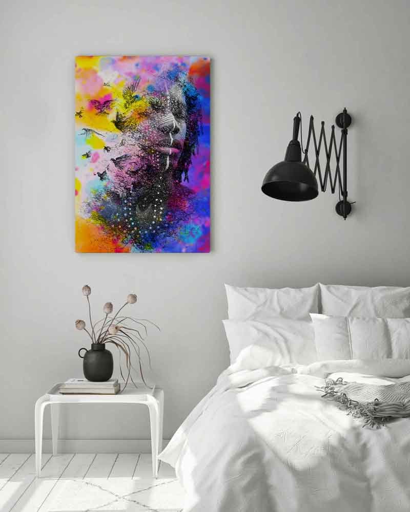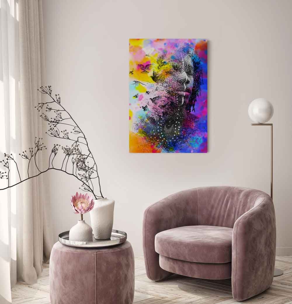 Immerse yourself in the vibrant narrative of ‘Harmony in Diversity.’ This abstract canvas print beautifully blends elements of Africa, American artistry, and the colorful presence of birds. The closed composition creates a conceptual masterpiece, symbolizing unity in diversity. Elevate your space with this unique and creative piece, a testament to the richness of artistic expression.