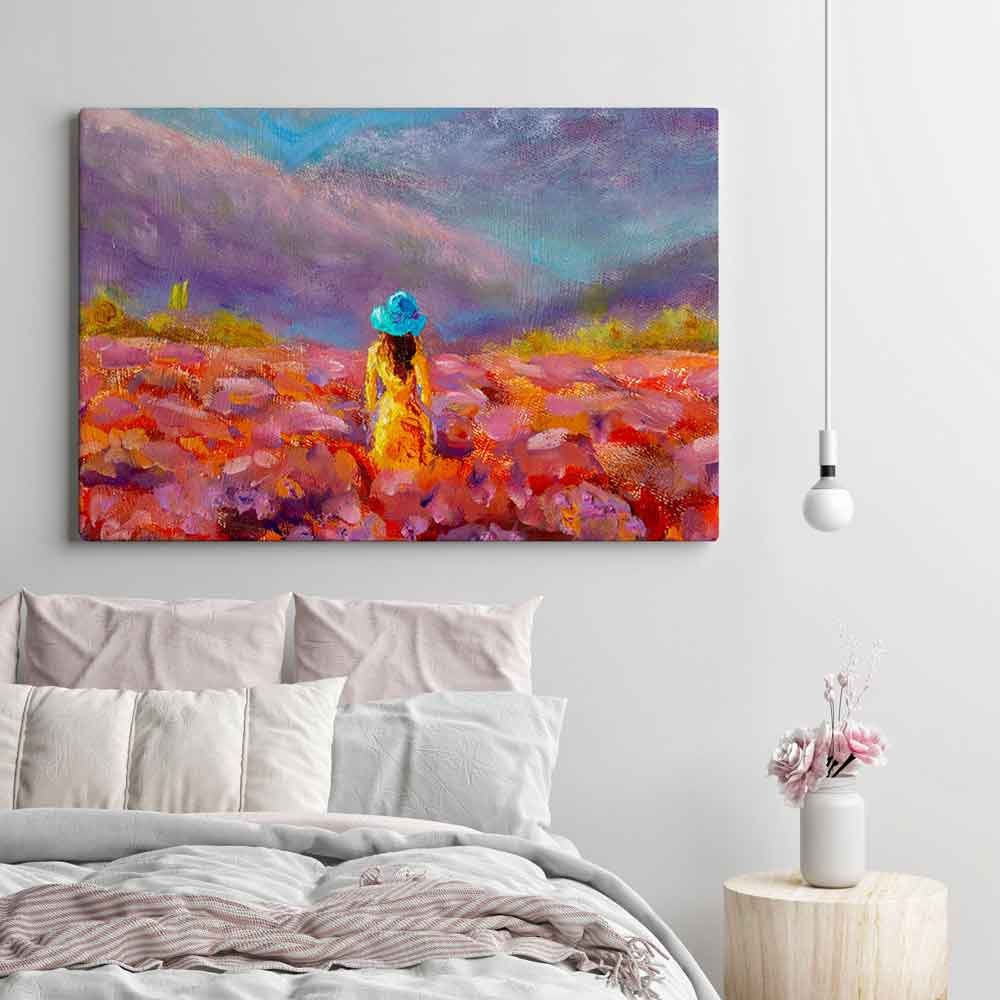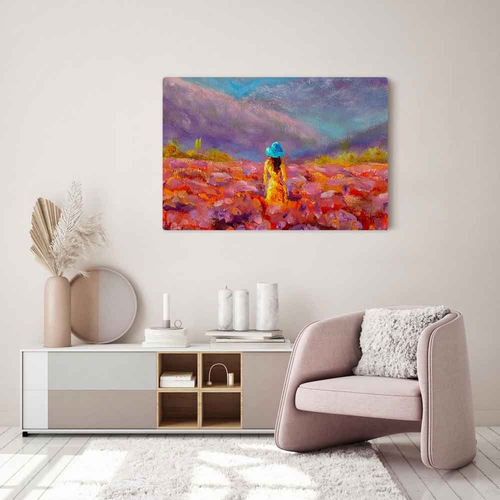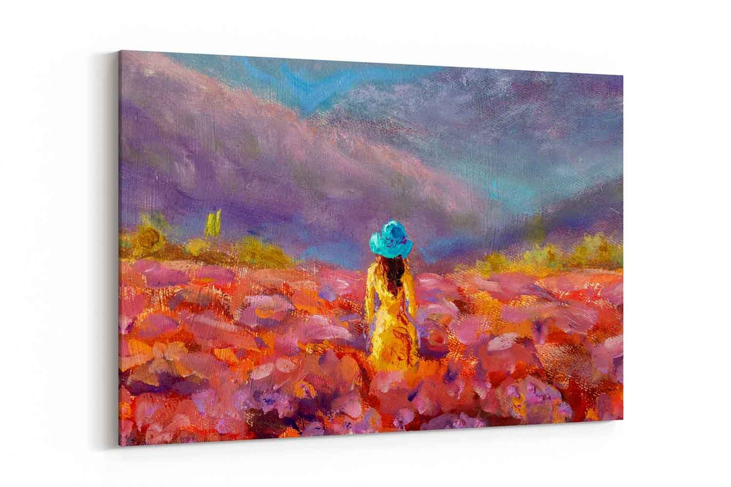 This captivating canvas print showcases a breathtaking oil painting featuring a beautiful girl standing amidst a lavender-pink flower field in a floral French Tuscan landscape. The delicate strokes and vibrant colors bring this scene to life, making it a perfect addition to your space.