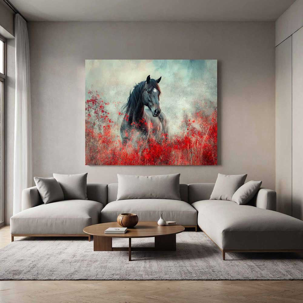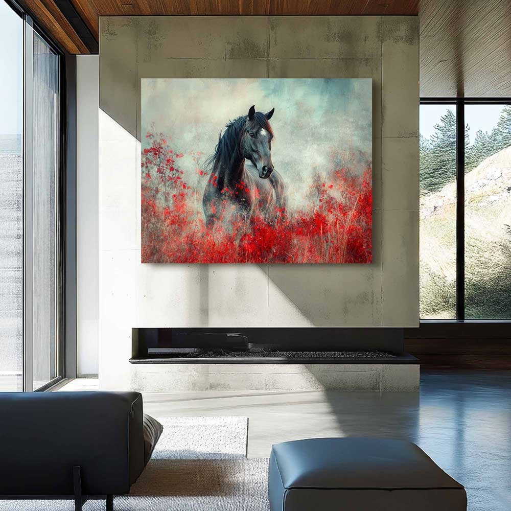 At the heart of this composition is a magnificent black stallion, a timeless symbol of freedom, spirit, and resilience. Its sleek, obsidian coat is set against a vibrant, endless sea of crimson wildflowers, creating a visual “pop” that is both dramatic and sophisticated. The rich red hues of the field evoke a sense of passion and energy, while the horse’s calm, commanding presence brings a grounded, serene atmosphere to your living space.
