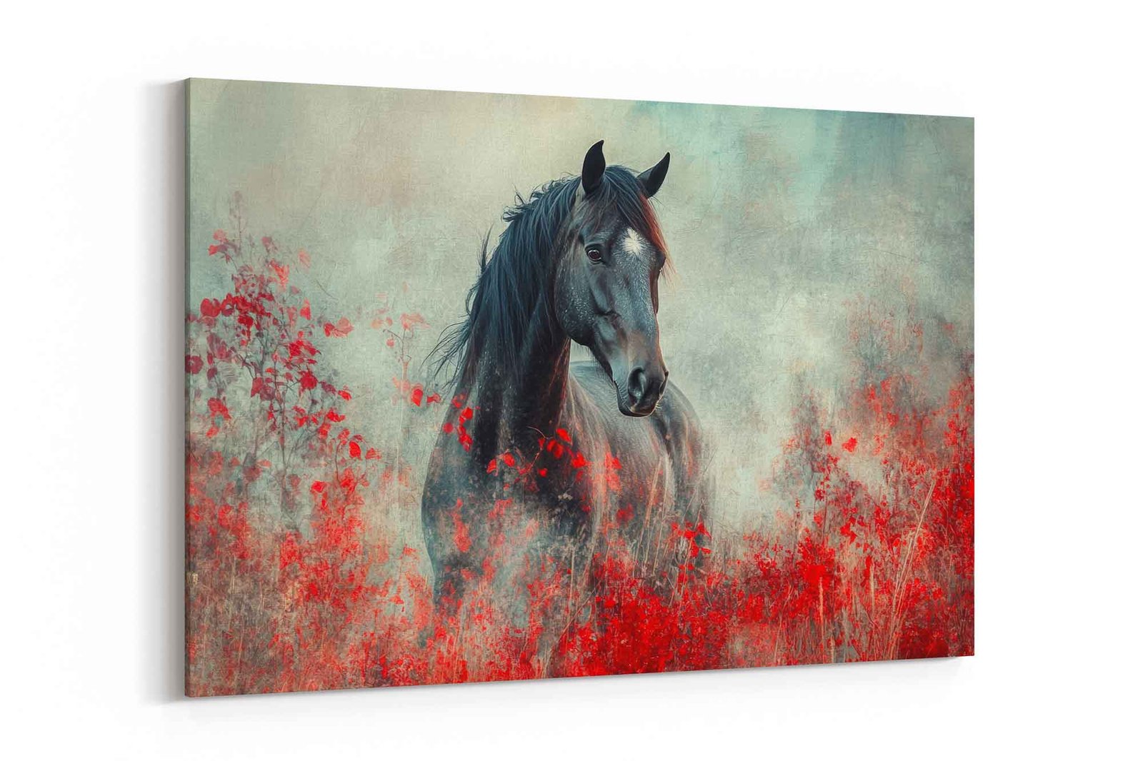 Majestic Black Stallion in Red Floral Field Canvas Print – Equestrian Wall Art