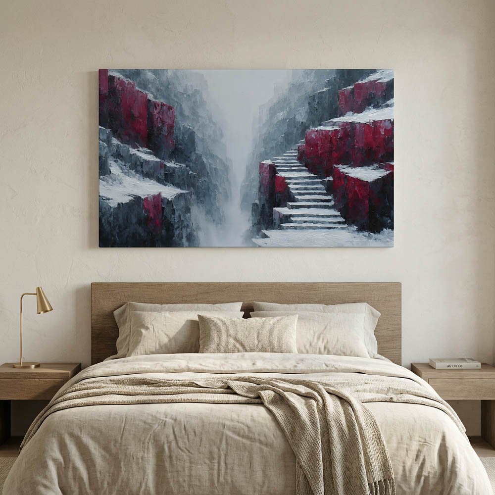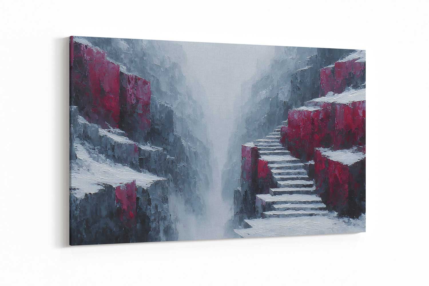 Misty Canyon with Stone Stairs Canvas Wall Art – Ethereal Red Rock Abstract Landscape Print – Moody Textured Mountain Statement Piece for Living Room