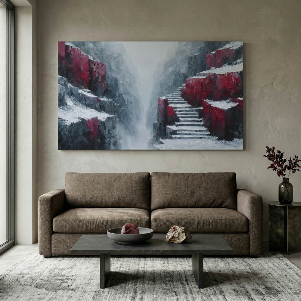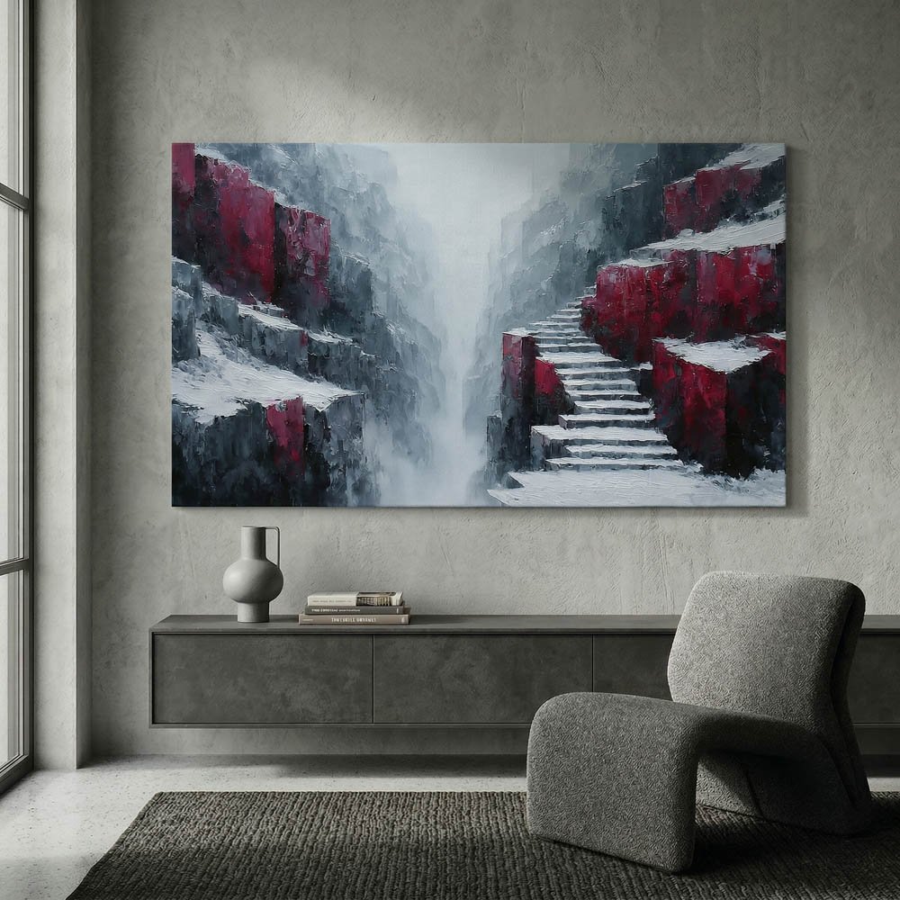 Witness a breathtaking misty canyon where ancient stone stairs appear to ascend into an unknown, fog-shrouded expanse. The striking red rock formations emerge from the mist with powerful presence, rendered with a moody textured mountain statement piece quality that creates incredible depth and a tactile feel. The abstract elements blend seamlessly with realistic details, offering a unique and contemplative view that captivates the imagination.