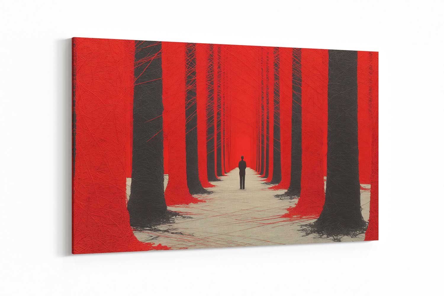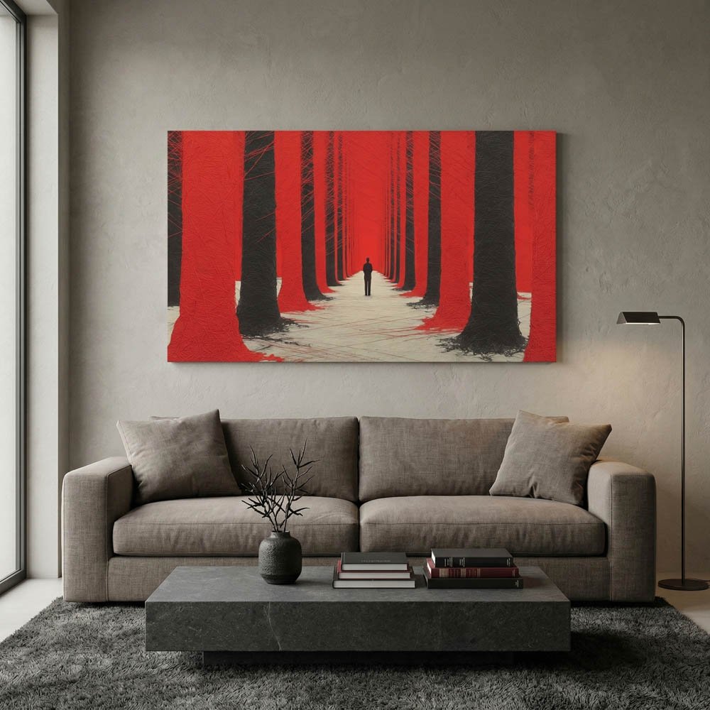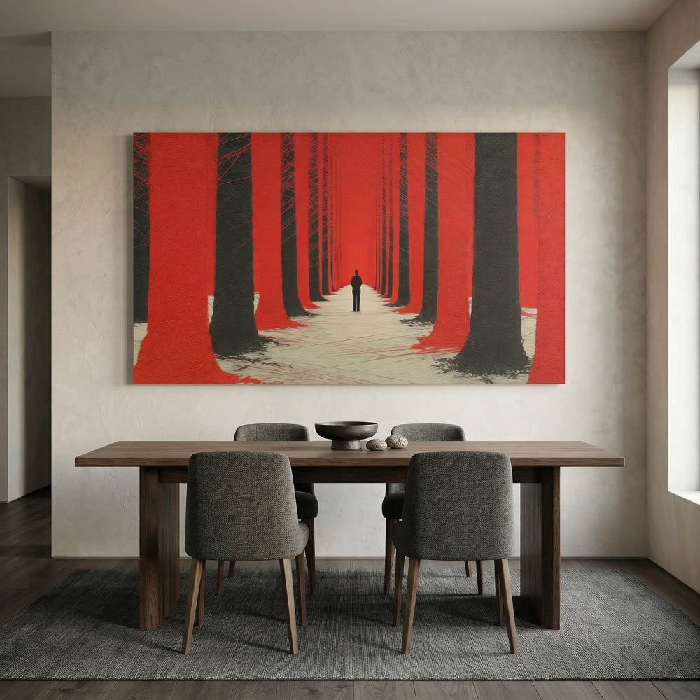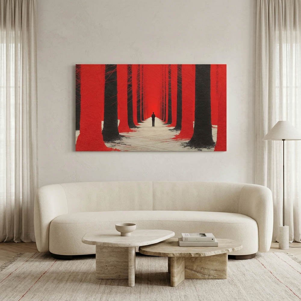 Modern Red Forest Canvas Wall Art – Abstract Symmetrical Black Trees Print – Surreal Lone Figure Statement Piece Ready to Hang