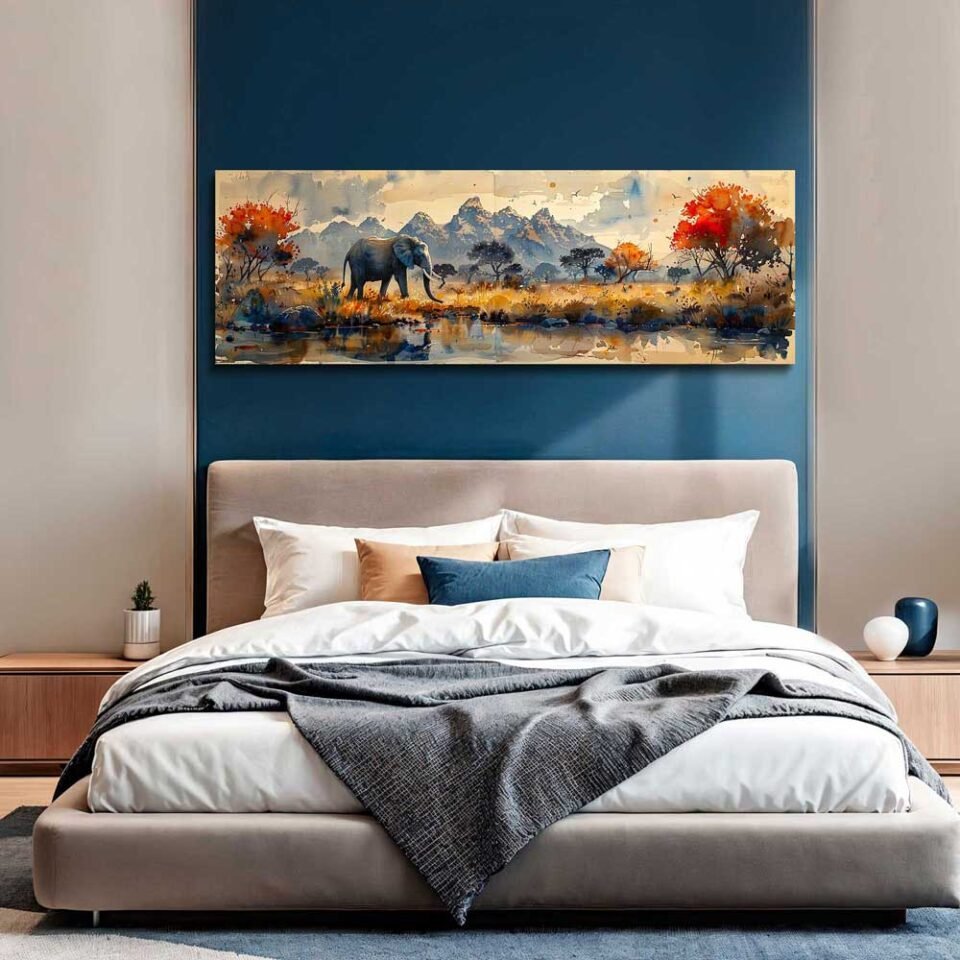 Panoramic Watercolour Elephant Canvas – African Safari Landscape & Mountain Lake Wall Art