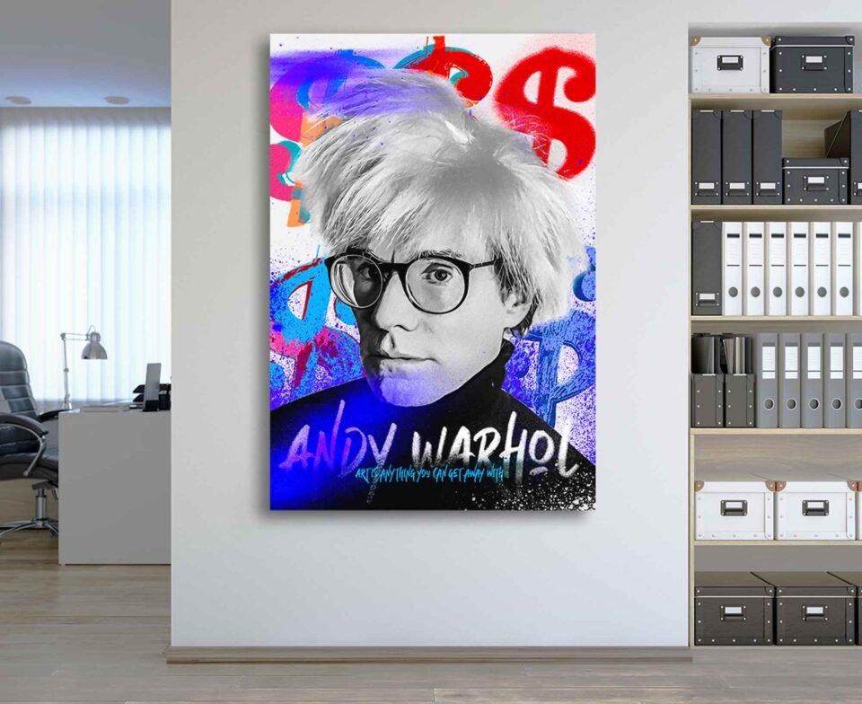 This striking portrait features Andy Warhol himself, set against an explosive backdrop of colorful spray paint. Bold splashes, drips, and abstract dollar signs in electric blues, reds, pinks, greens, and purples create a raw, energetic aesthetic that perfectly blends classic Pop Art sensibilities with contemporary street art edge. The prominent ” WARHOL” signature, rendered in bold graffiti, grounds the piece in artistic legacy while celebrating a fresh, urban twist. It’s a statement artwork that challenges perceptions, inspires creativity, and adds an undeniable cool factor to any modern space.