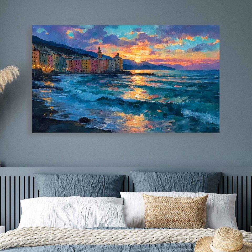 This captivating artwork perfectly encapsulates the magic of a picturesque village nestled against the gentle rhythm of the ocean at dusk, offering a timeless escape on your wall.