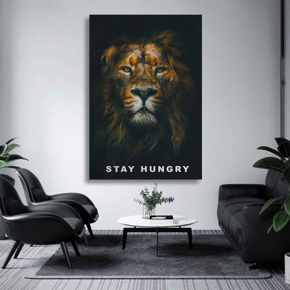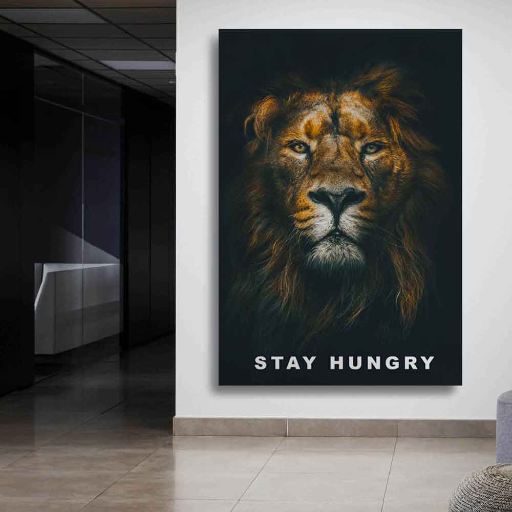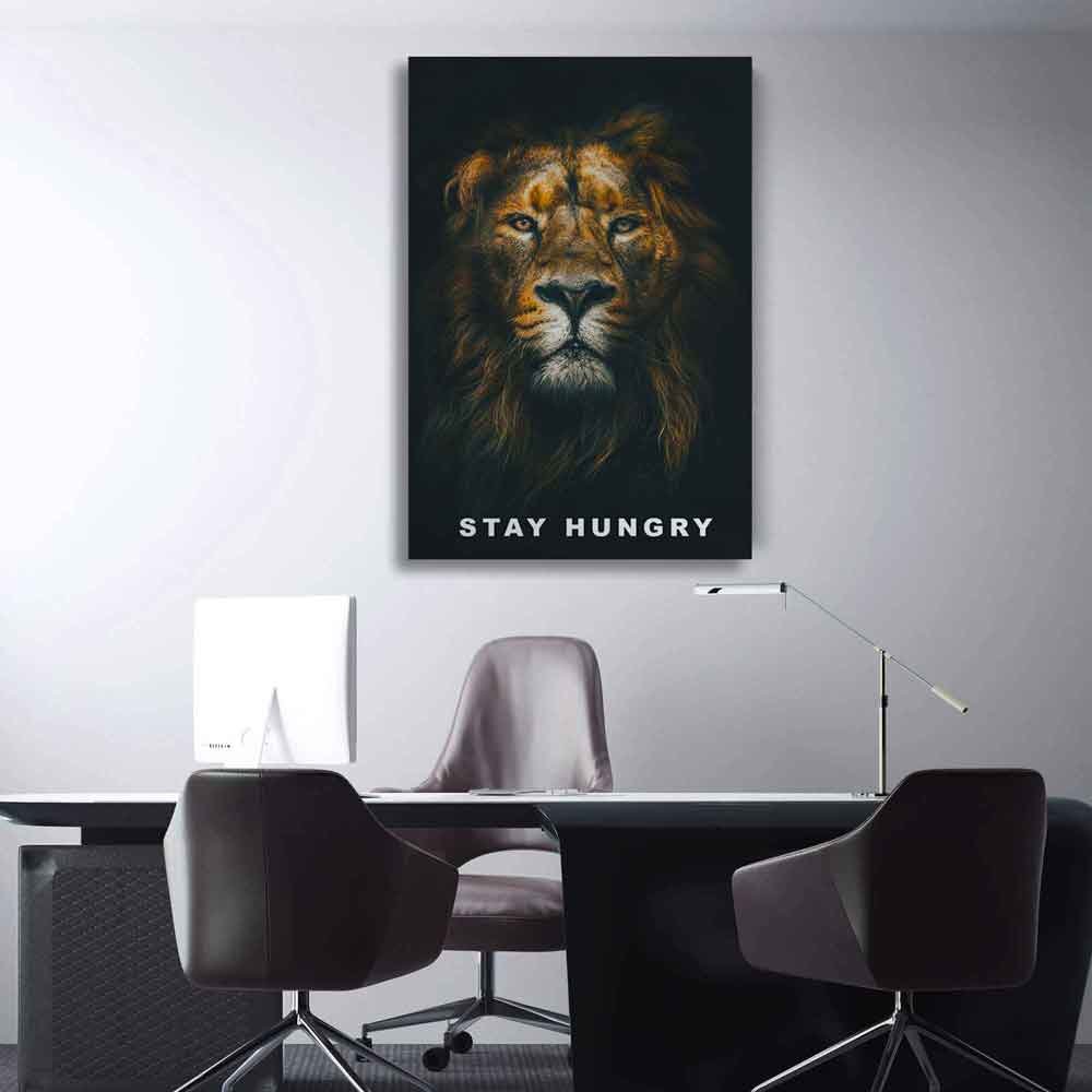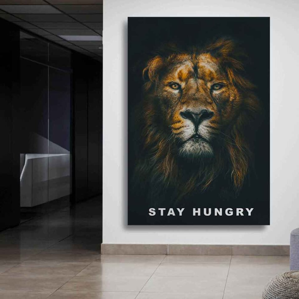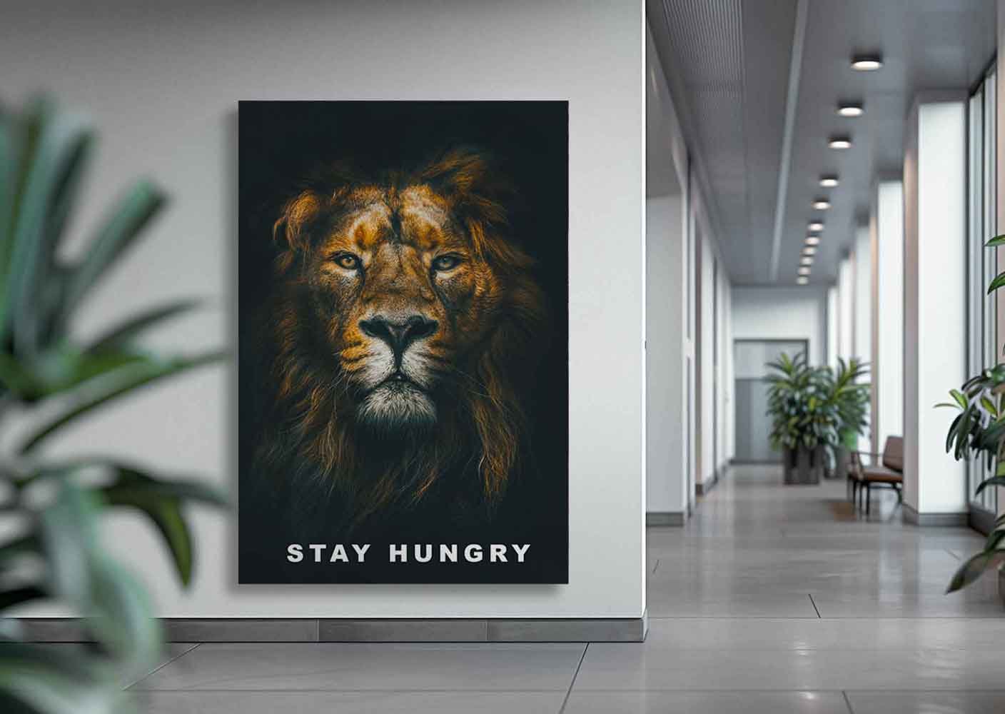 Stay Hungry, Stay Foolish. This motivational wall art featuring a majestic lion is the perfect addition to any modern office or home. Inspire yourself and your team with this powerful message. Ideal for entrepreneurs, business leaders, and anyone seeking daily inspiration. Our high-quality canvas prints are designed to last and make a bold statement.