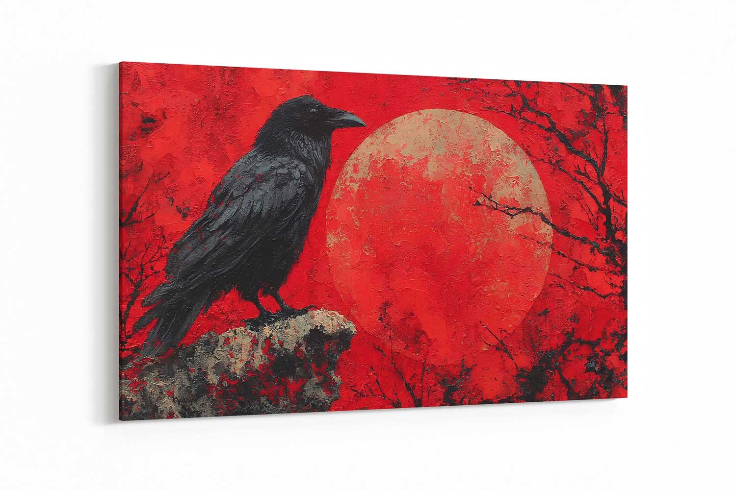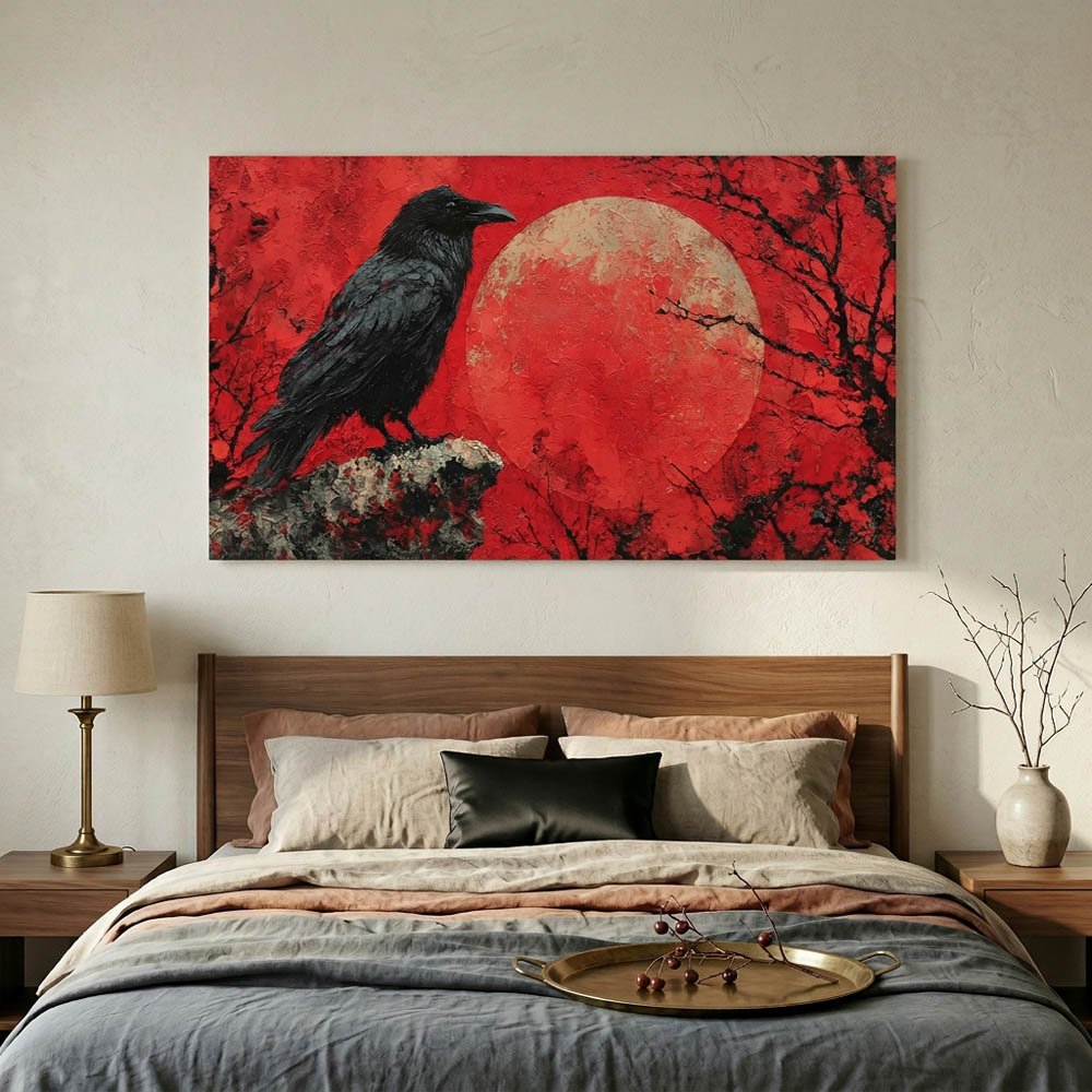 Vibrant Red Moon Raven Canvas Art – Textured Impasto Crow Wall Decor – Gothic Nature Statement Piece – Black and Red Bird Print Ready to Hang