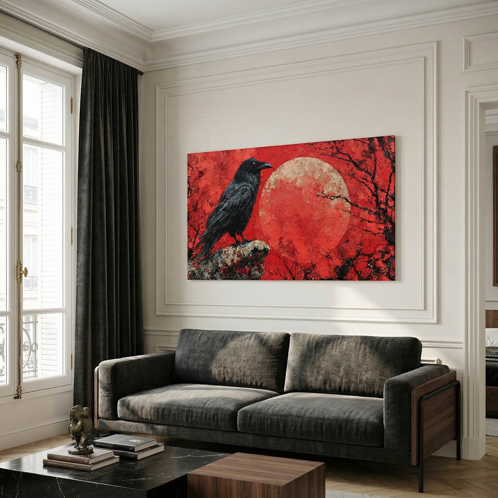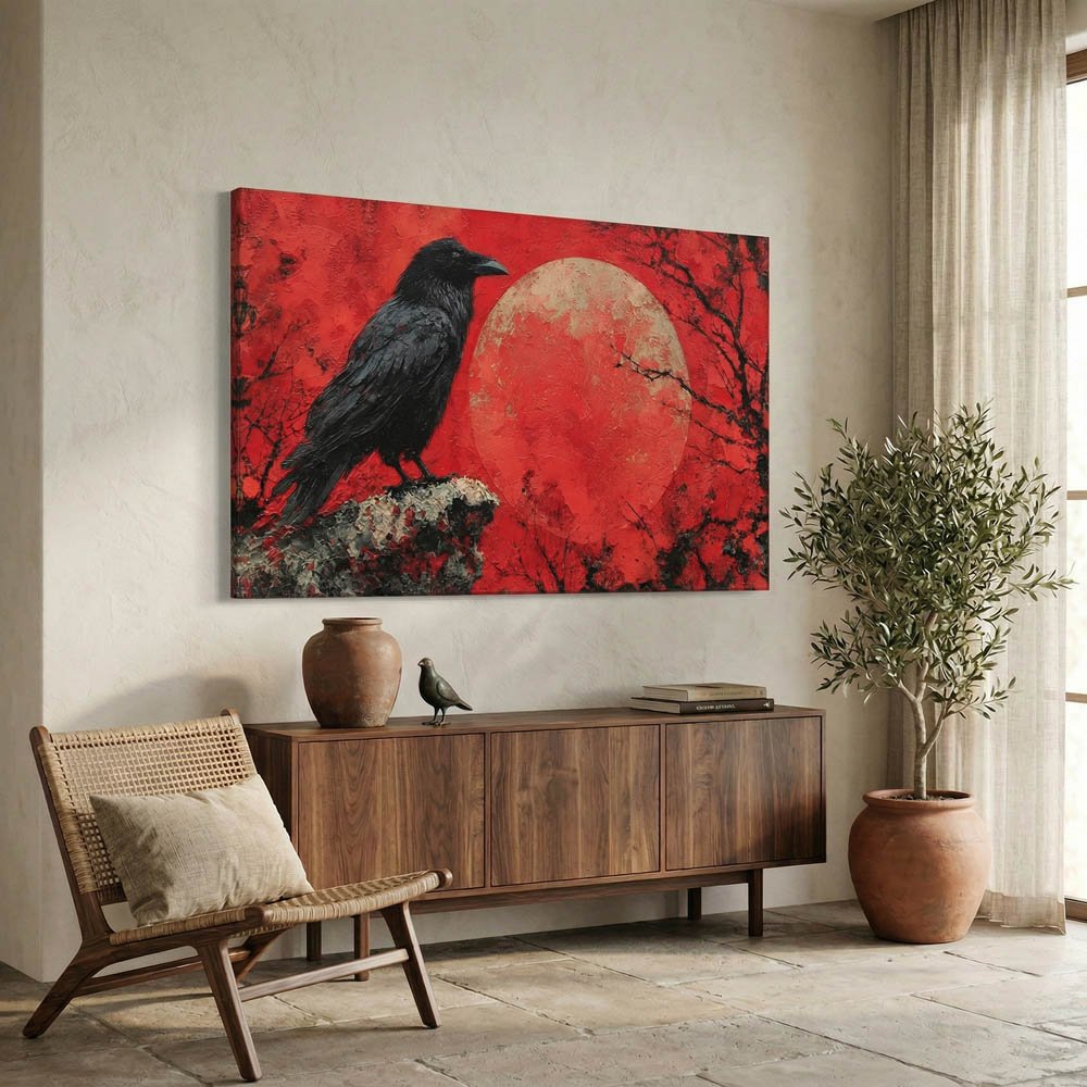 Unleash a captivating aura of mystery and raw artistic energy into your home with our Impasto Black Raven and Red Moon Canvas. This extraordinary piece is more than just a print; it’s a profound modern expressionist bird painting reproduction that brings dramatic flair and intense emotion to any wall.