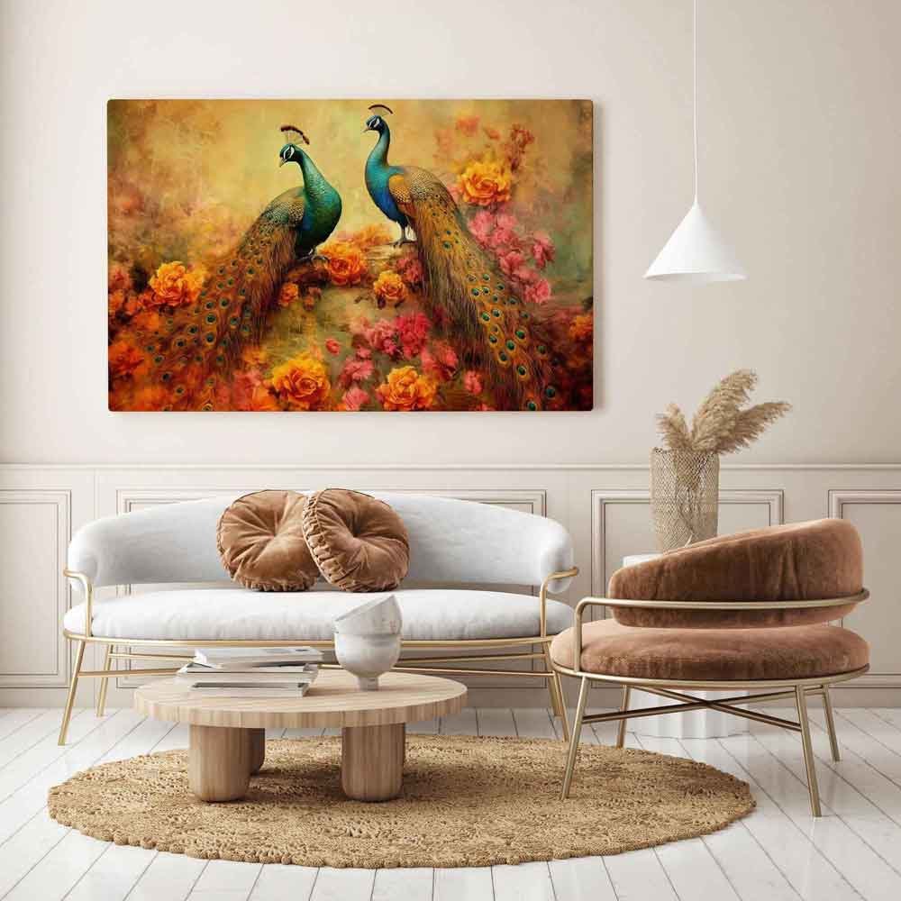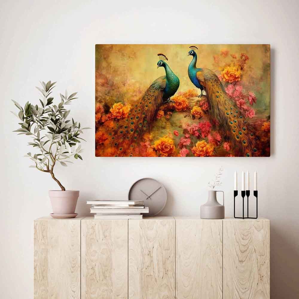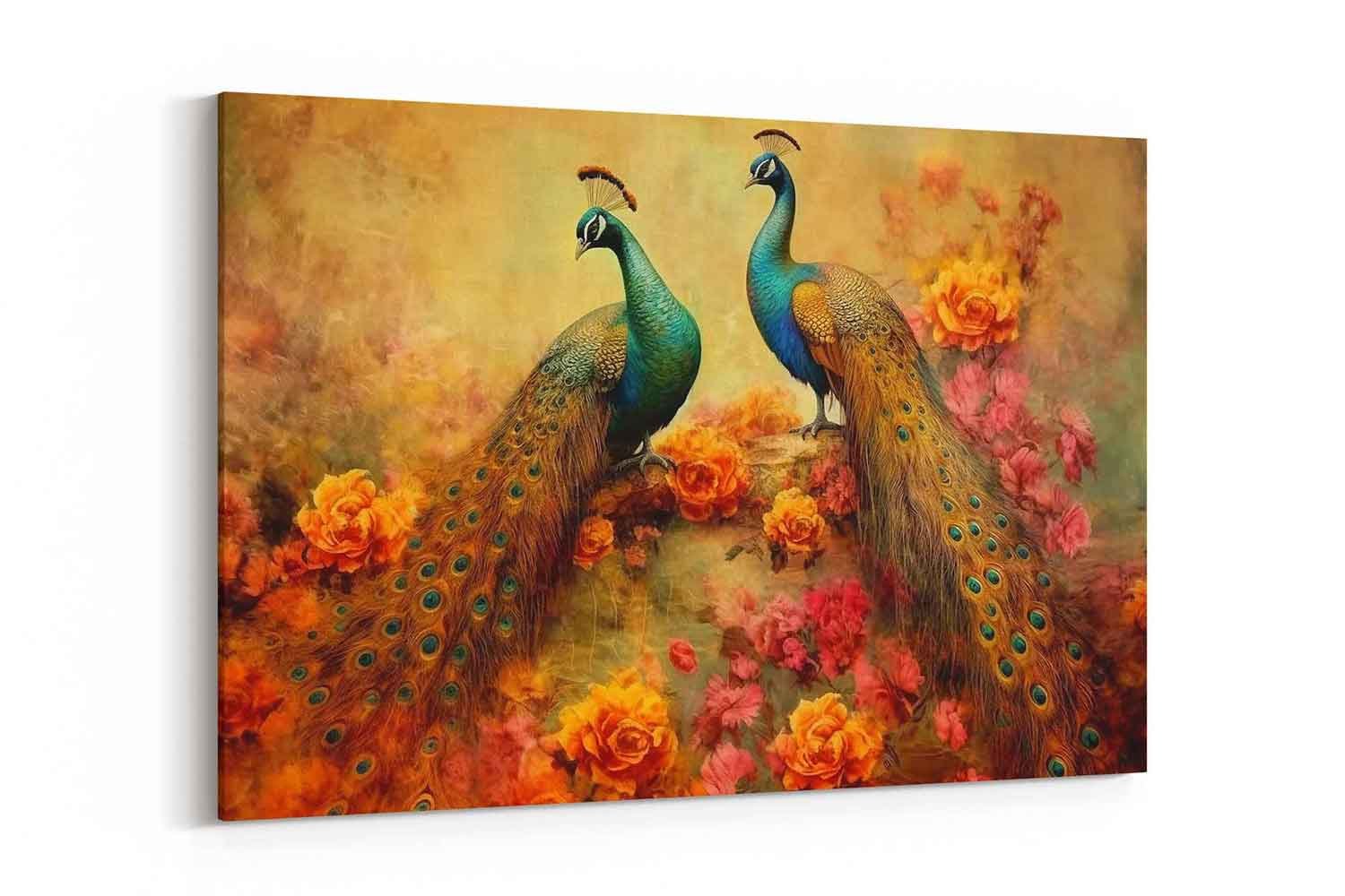 This canvas print beautifully captures the essence of vintage illustration with intricate floral plants, gracefully adorned branches, and majestic peacocks. The artwork, rendered in a modern art style, combines classic elegance with a touch of contemporary flair. The rich color palette adds vibrancy to any room, making it a stunning focal point for your home or office.