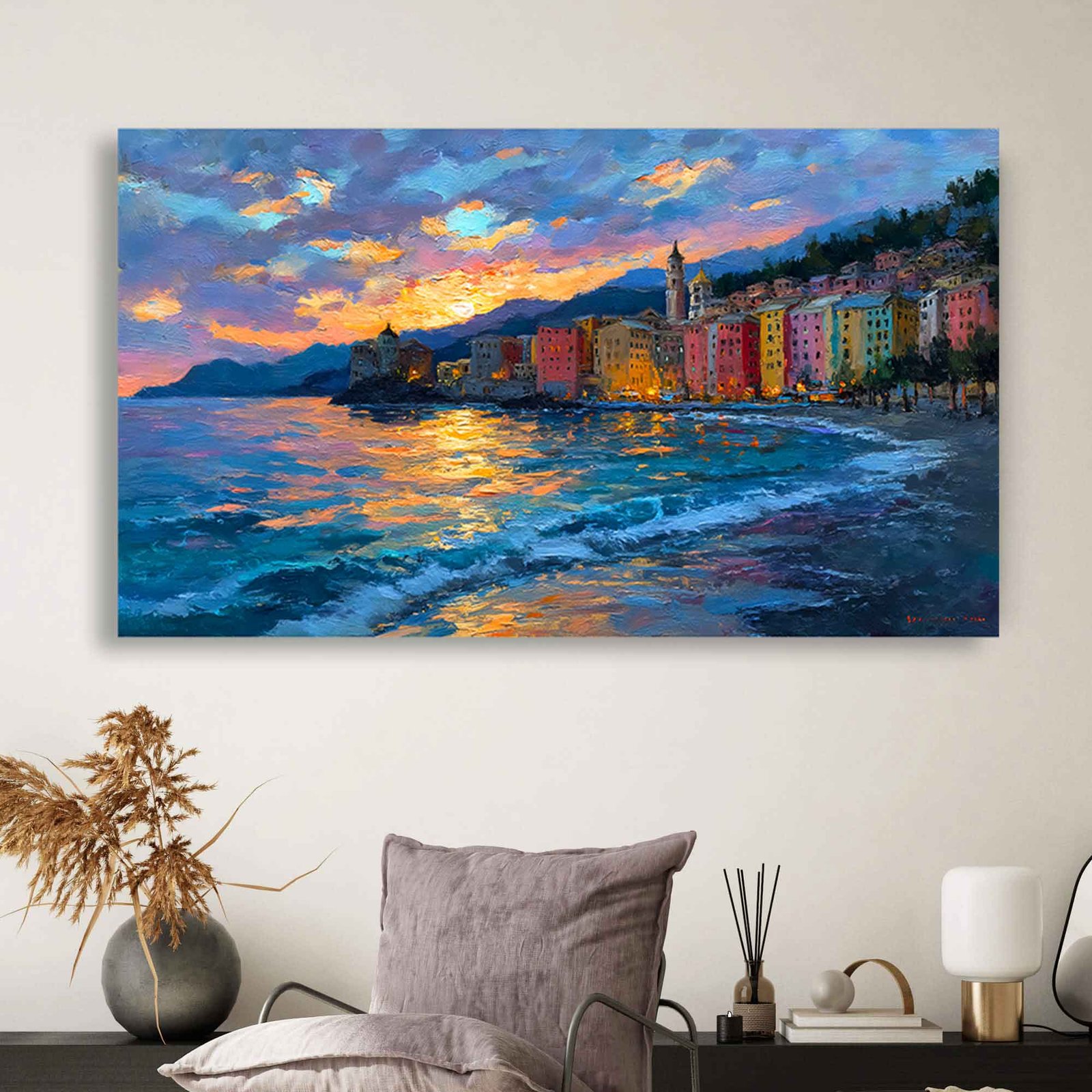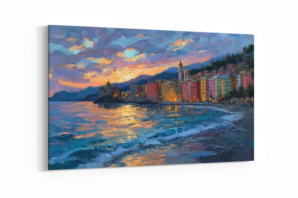 Escape to the magic of the Mediterranean twilight with our Twilight Italian Coastal Beach Canvas Print. This breathtaking piece captures a serene Seascape Sunset Painting as the last glow of day melts into a soft, illuminated night over a charming Romantic Ocean Village.
