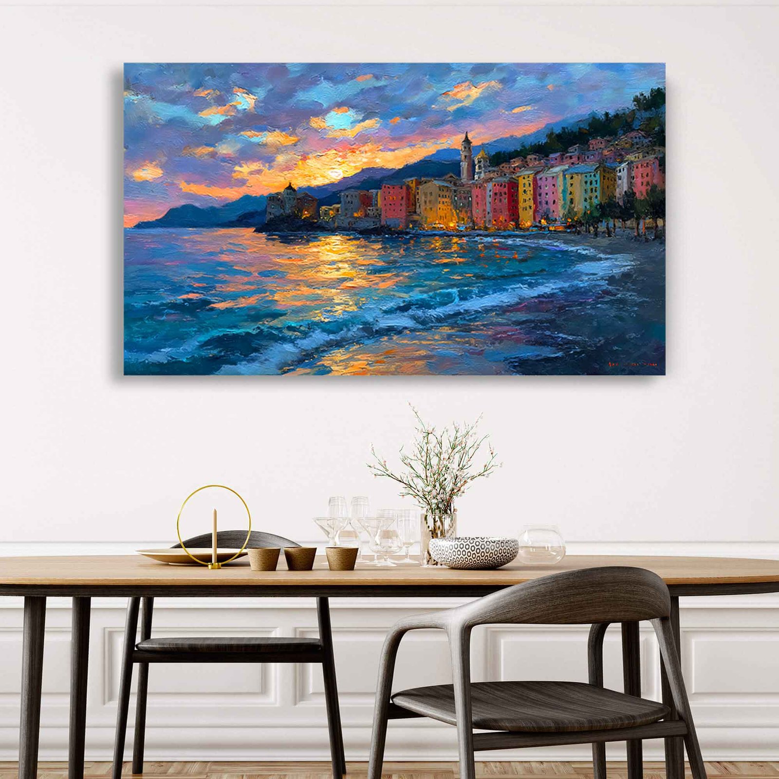 Perfect for bringing a sense of peace, romance, and European travel into your home, this wall art serves as an exquisite focal point. Hang it in your master bedroom to inspire tranquility or in your living room to invite conversation and warmth. It is an ideal piece for those who cherish memories of seaside holidays and the unparalleled beauty of an Italian evening.