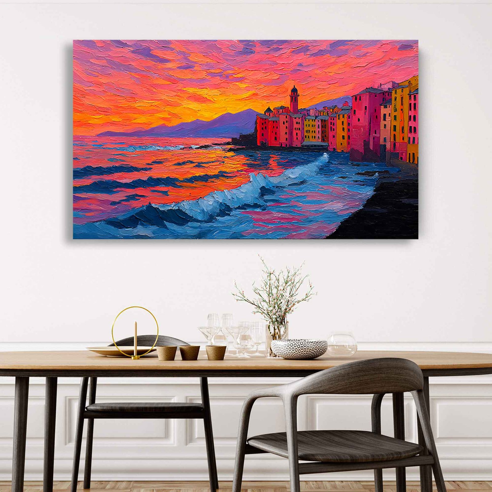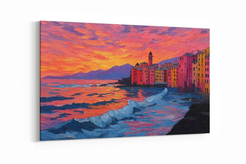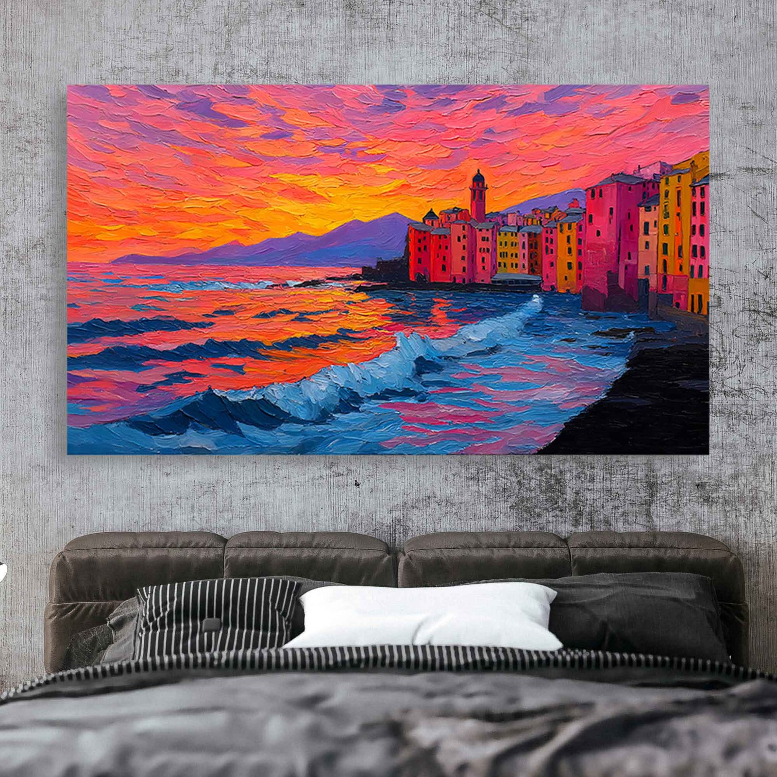 Witness the explosive beauty of a Mediterranean evening with our Dramatic Sunset Coastal Art Print. This stunning canvas captures a picturesque European Townscape nestled against an ocean raging with the final, fiery light of the sun. Itโs an immediate focal point that brings high drama and intense color to any wall.