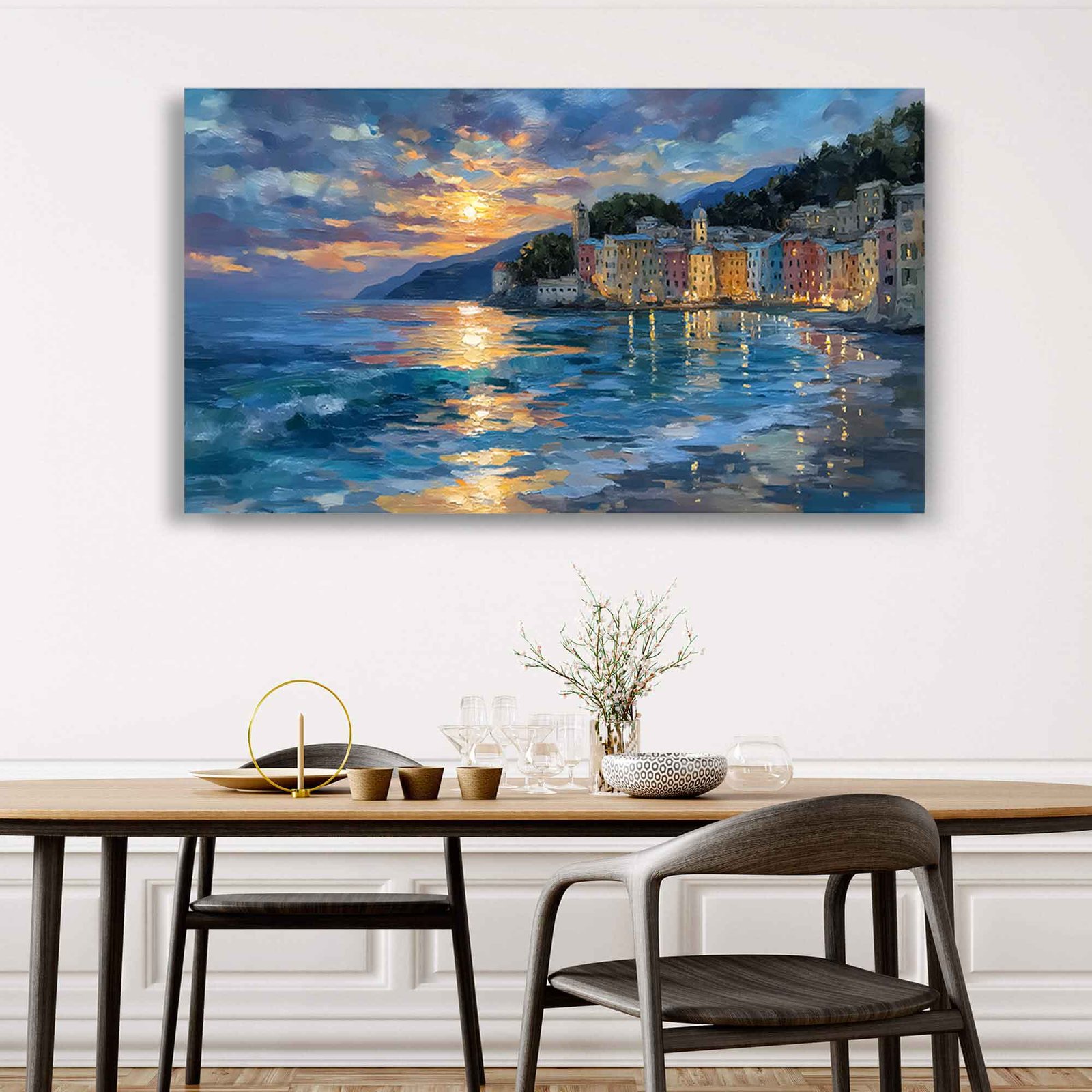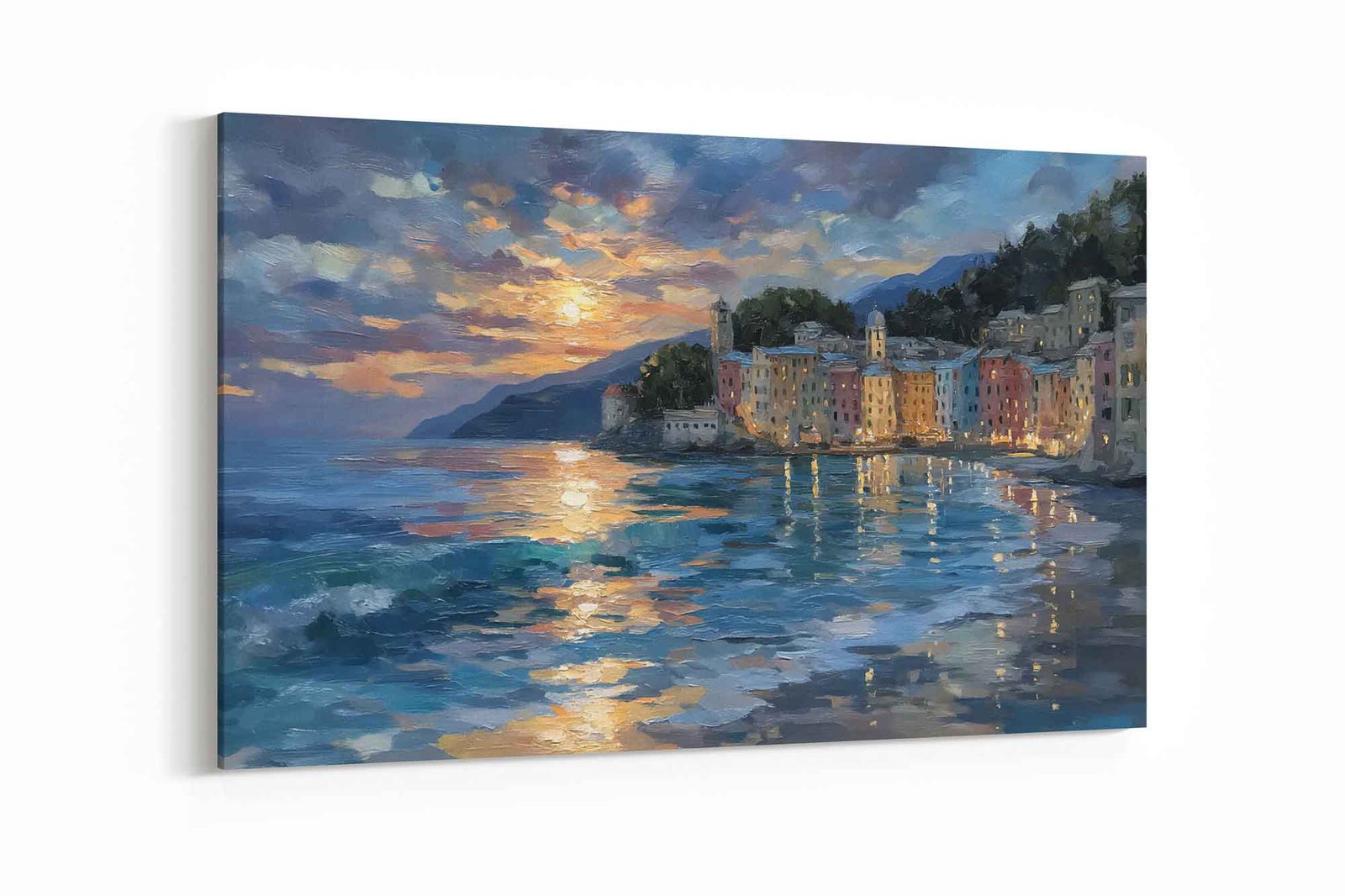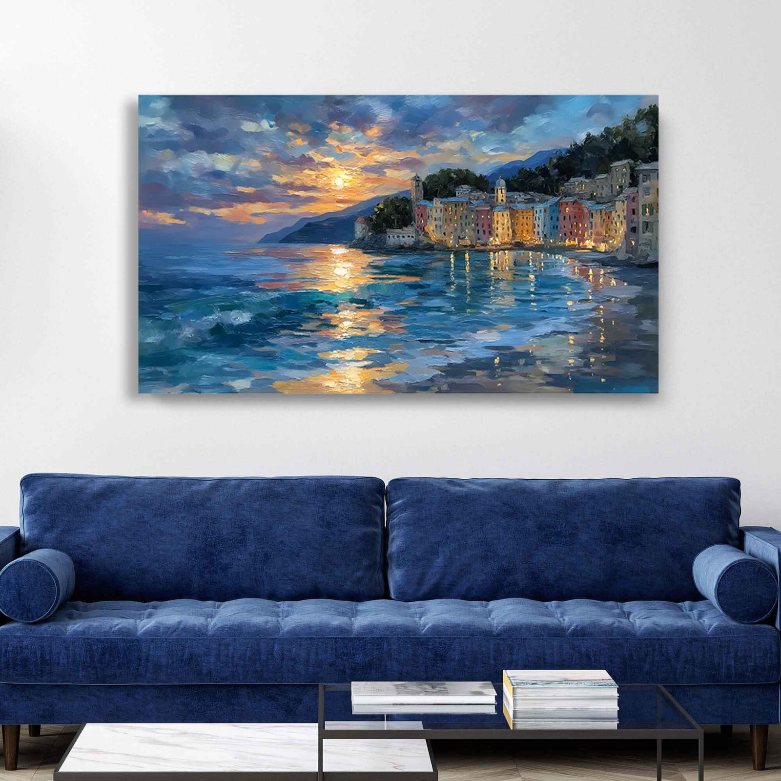 Step into a world of serene enchantment with our “Coastal Scene at Night Canvas Art.” This captivating piece transports you to a charming ocean village under the gentle embrace of night, where the moon casts a luminous glow over the tranquil waters and the distant lights of the village shimmer like scattered jewels. Itโs an invitation to experience the quiet magic and romance of a peaceful coastal evening.