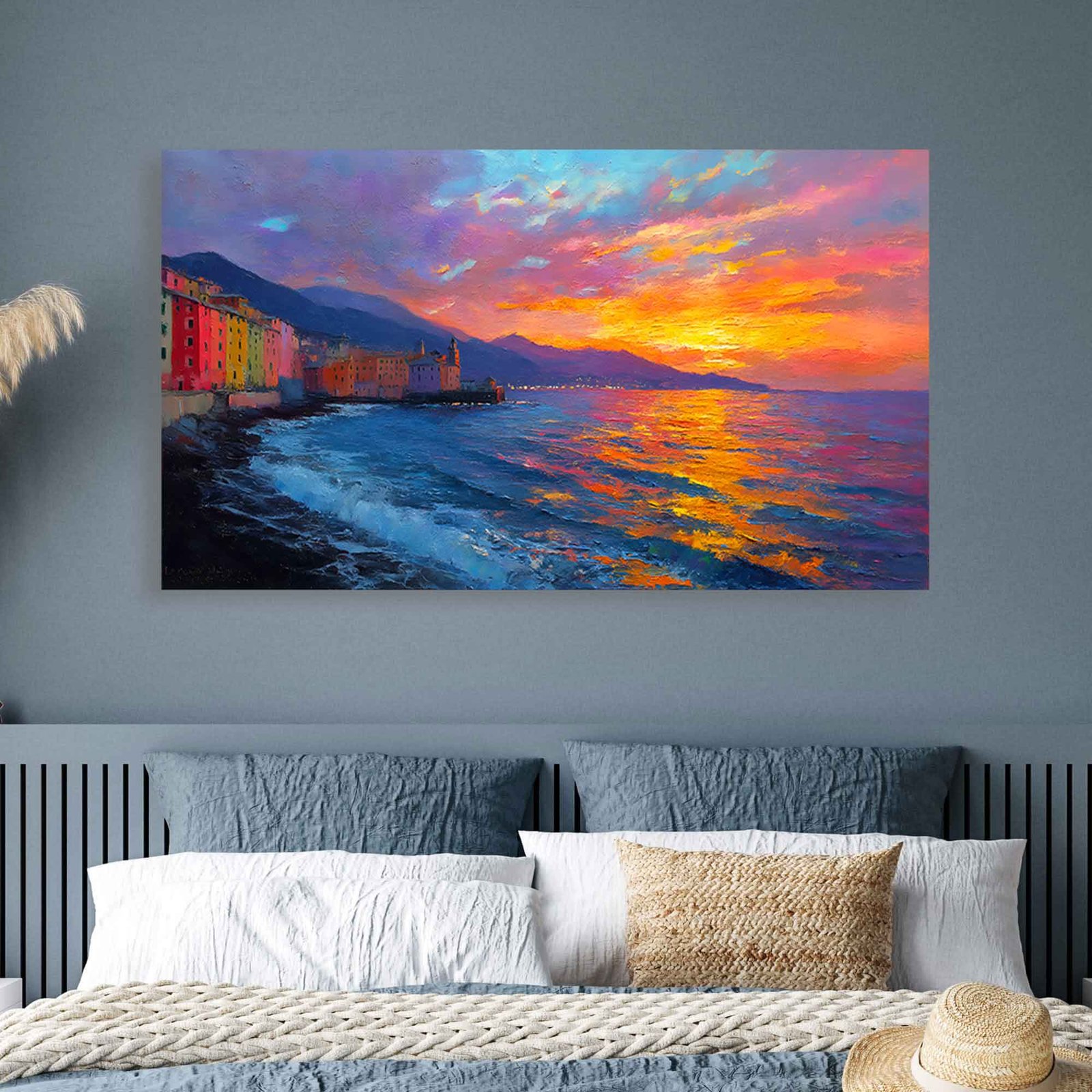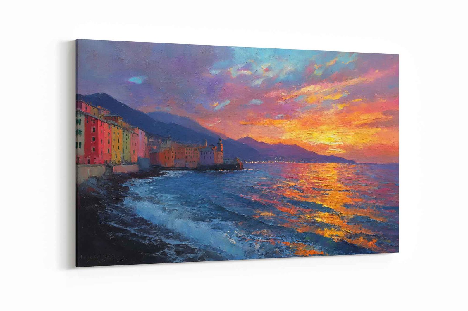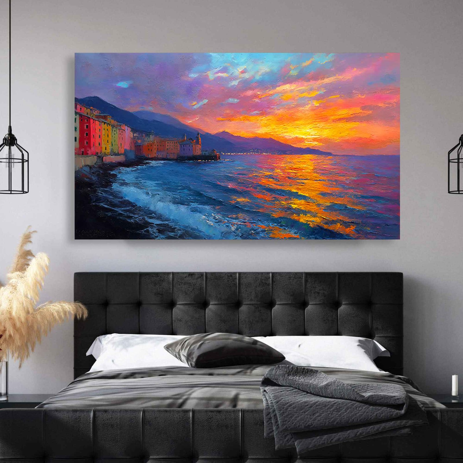 Bring the dramatic, fiery beauty of a Mediterranean evening right onto your wall with our Italian Sunset Canvas Print. This captivating artwork captures a coastal Italian village basking in the last, explosive light of dusk, featuring an intense Orange and Blue Sunset that transforms the sky and sea into a canvas of pure energy.