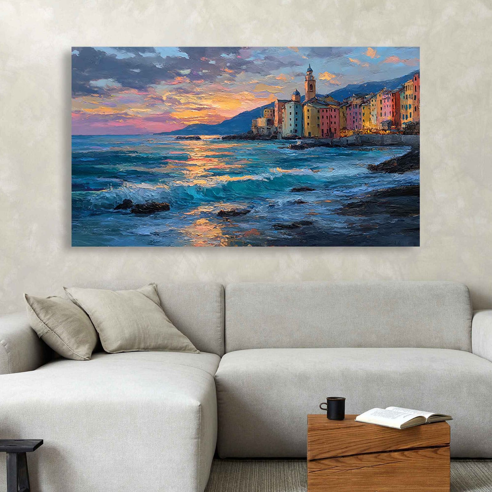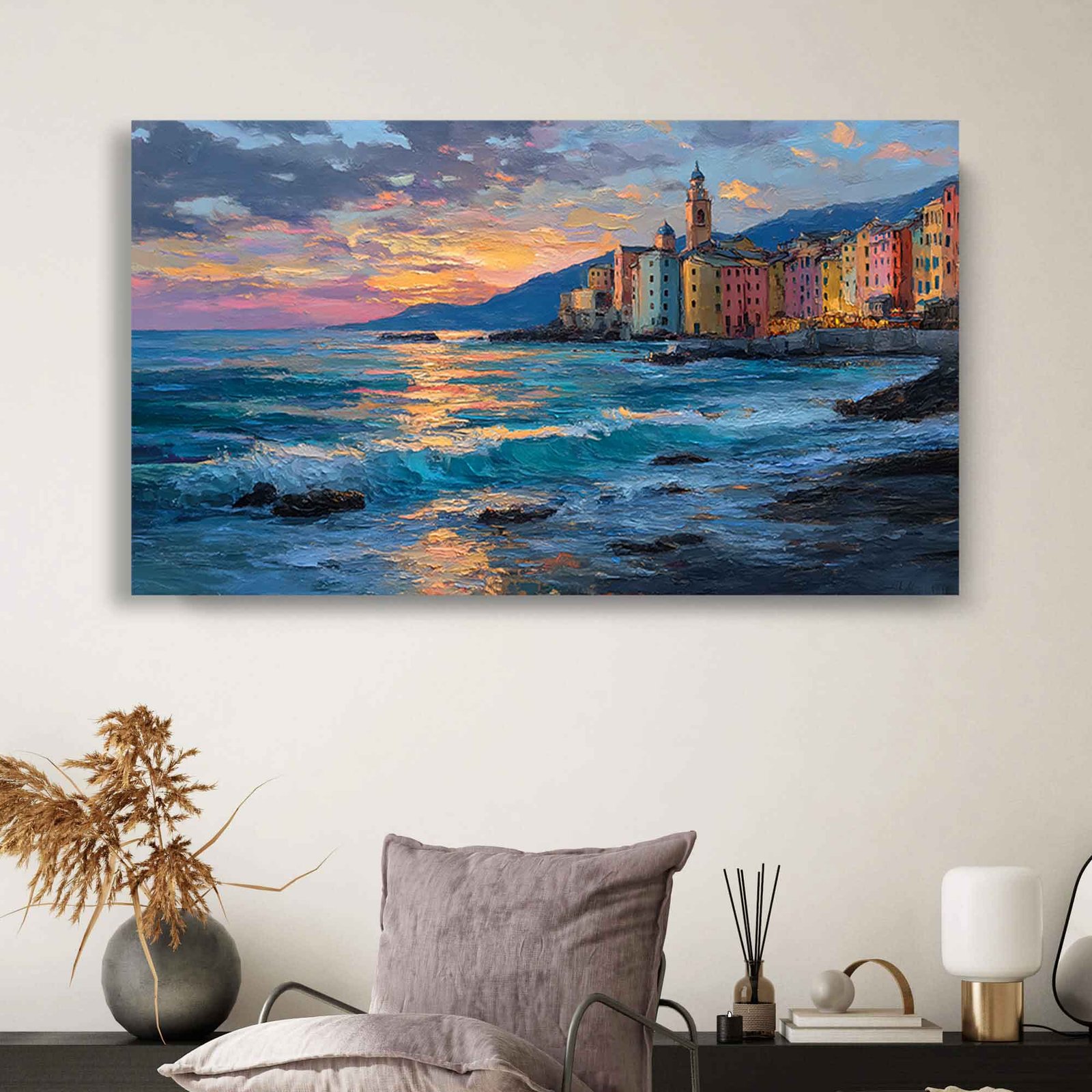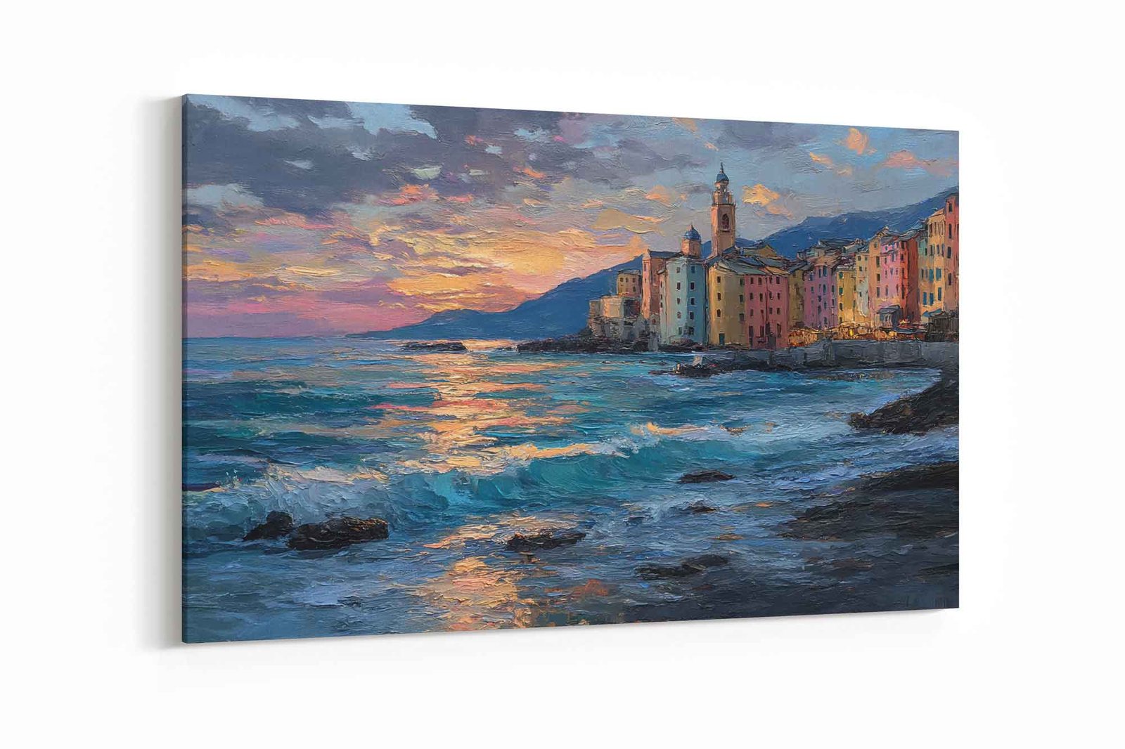 This canvas is not just a photograph; it’s a piece of expressive art. The print expertly reproduces the textured, impressionistic brushstrokes of the original painting, giving the architecture and the active ocean waves a palpable sense of depth and movement. Every glance will transport you to the peaceful yet vibrant energy of the Ligurian coast.