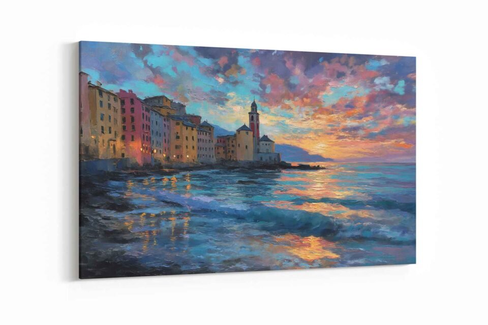 This exquisite canvas print is a stunning reproduction of a painting that beautifully conveys light, atmosphere, and a serene palette. The “Mediterranean Artwork” features a charming Italian village, its buildings glowing with the last rays of sunlight, set against a dramatic sky ablaze with oranges, purples, and deep blues. The gentle dusk ocean waves rhythmically caress the shore, adding a sense of calm movement to the scene. Every detail, from the sun-kissed architecture to the reflective waters, creates an atmosphere of inviting warmth and romantic allure.