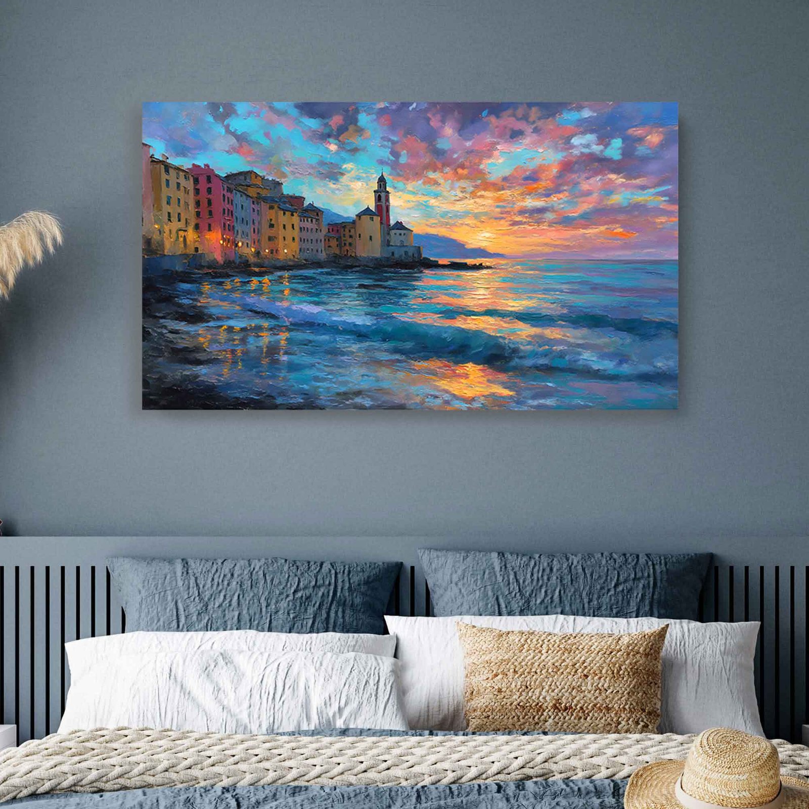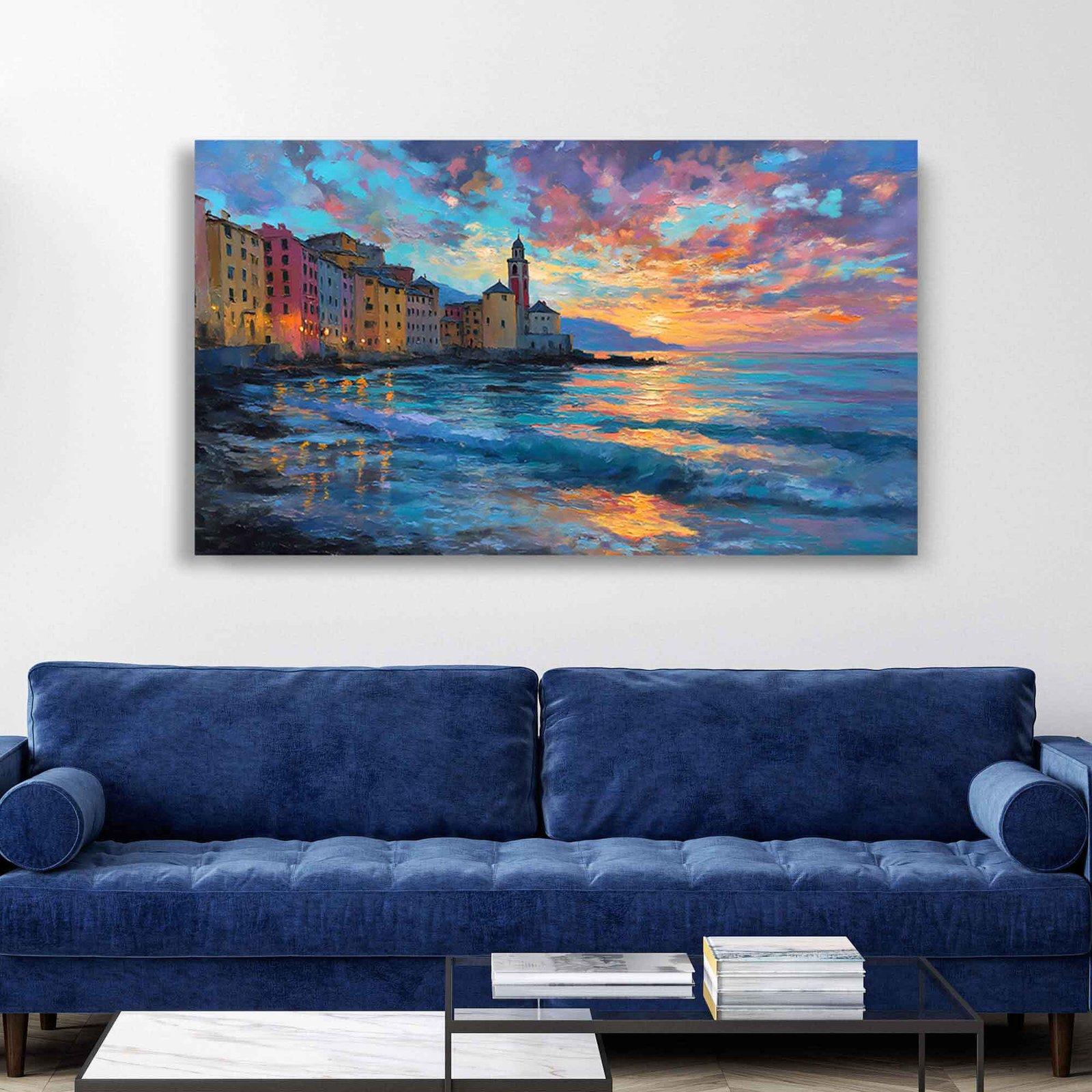 Mediterranean Sunset Coastal Town Canvas Print – Italian Seascape Wall Art, Dusk Ocean Waves Framed Wall Decor