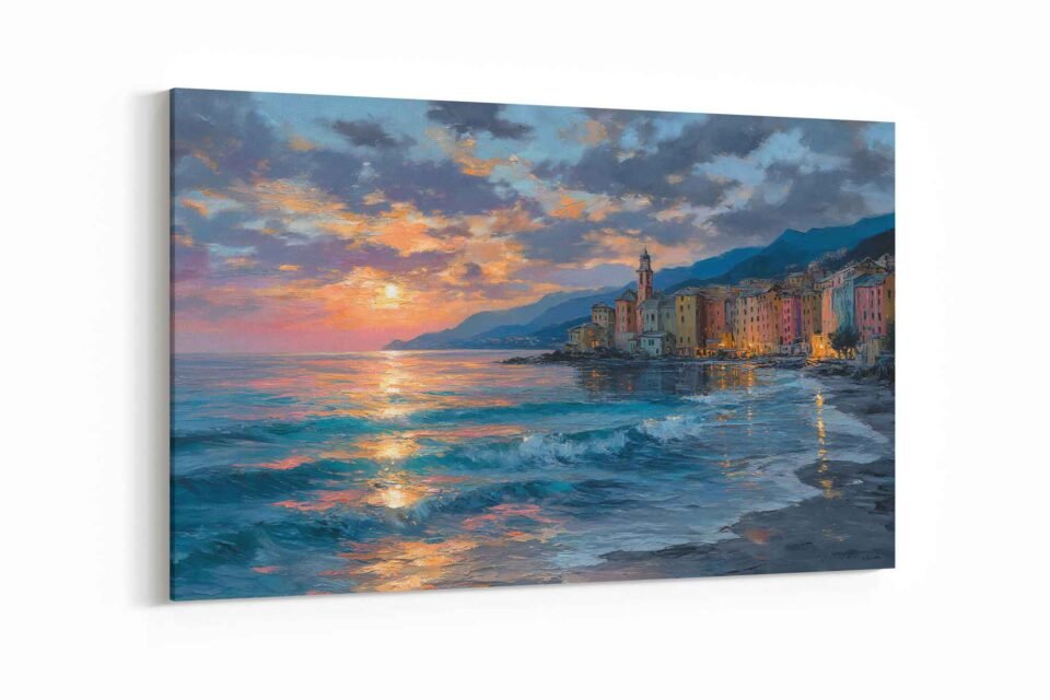 Immerse yourself in the serene beauty of a tranquil European sunset with our Dreamy European Coastal Scene on canvas print. This enchanting piece captures the ethereal glow of twilight descending upon a charming coastal village, where soft hues paint the sky and gently touch the calm ocean waters. It’s an invitation to pause, breathe, and lose yourself in a moment of sublime peace.