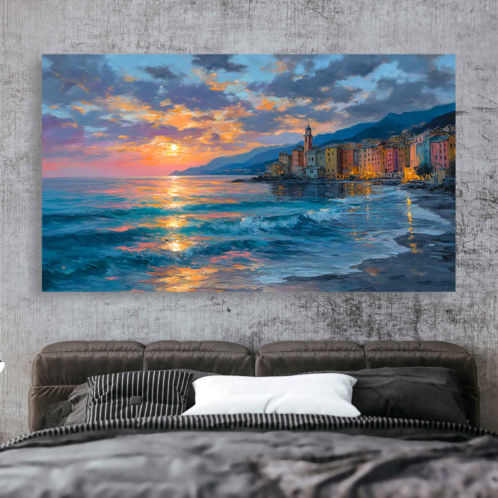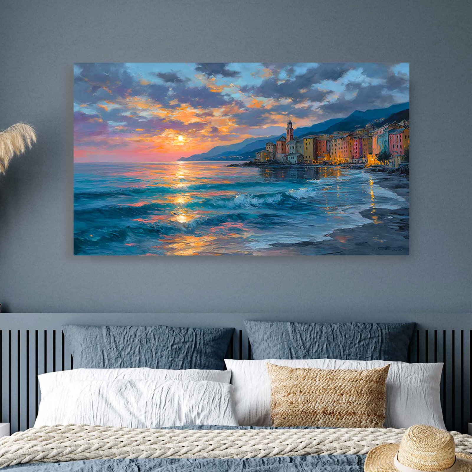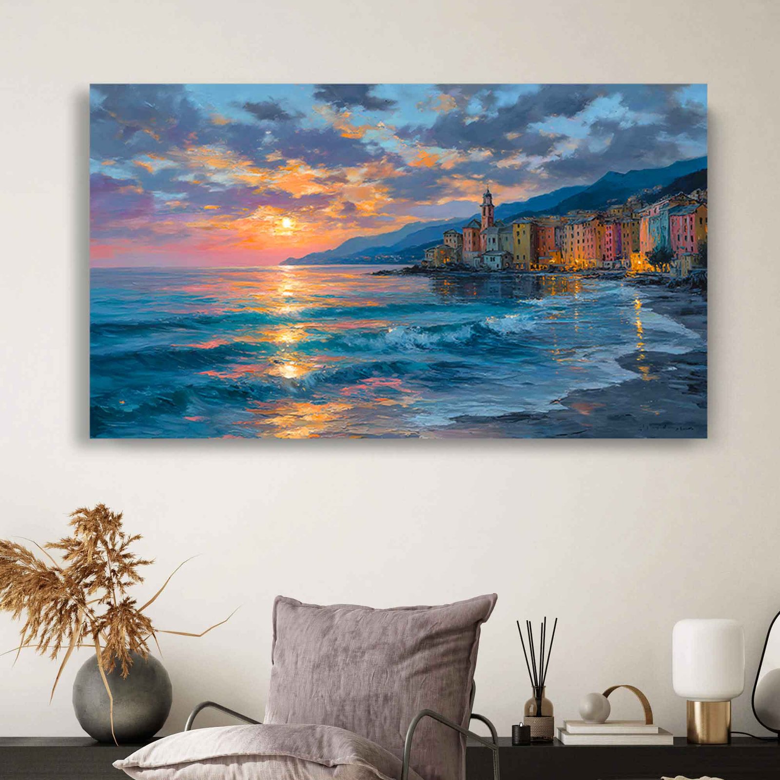 Pastel Sunset Ocean View Canvas Art, Soft Glow Coastal Village Painting, Dreamy European Seashore Canvas Wall Art