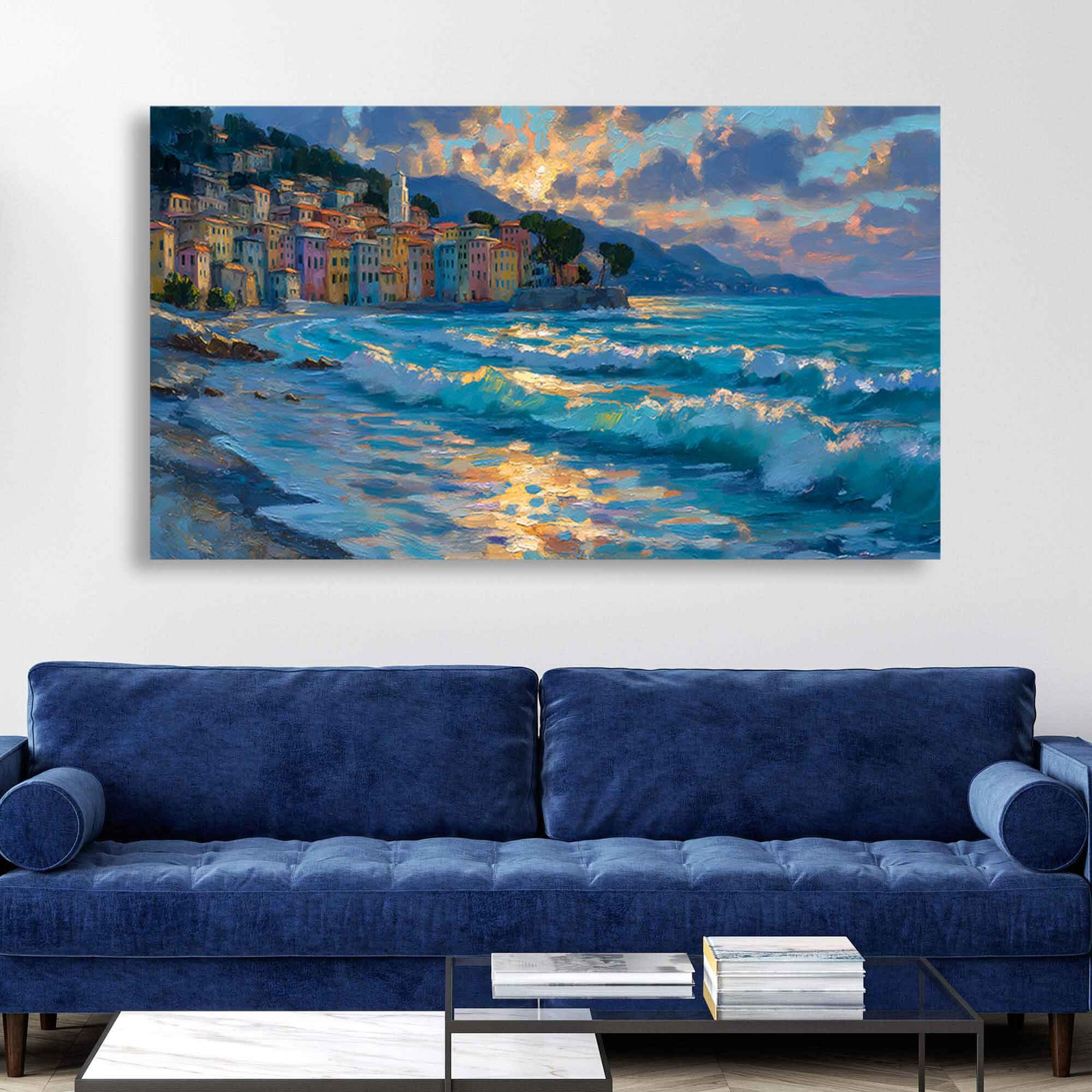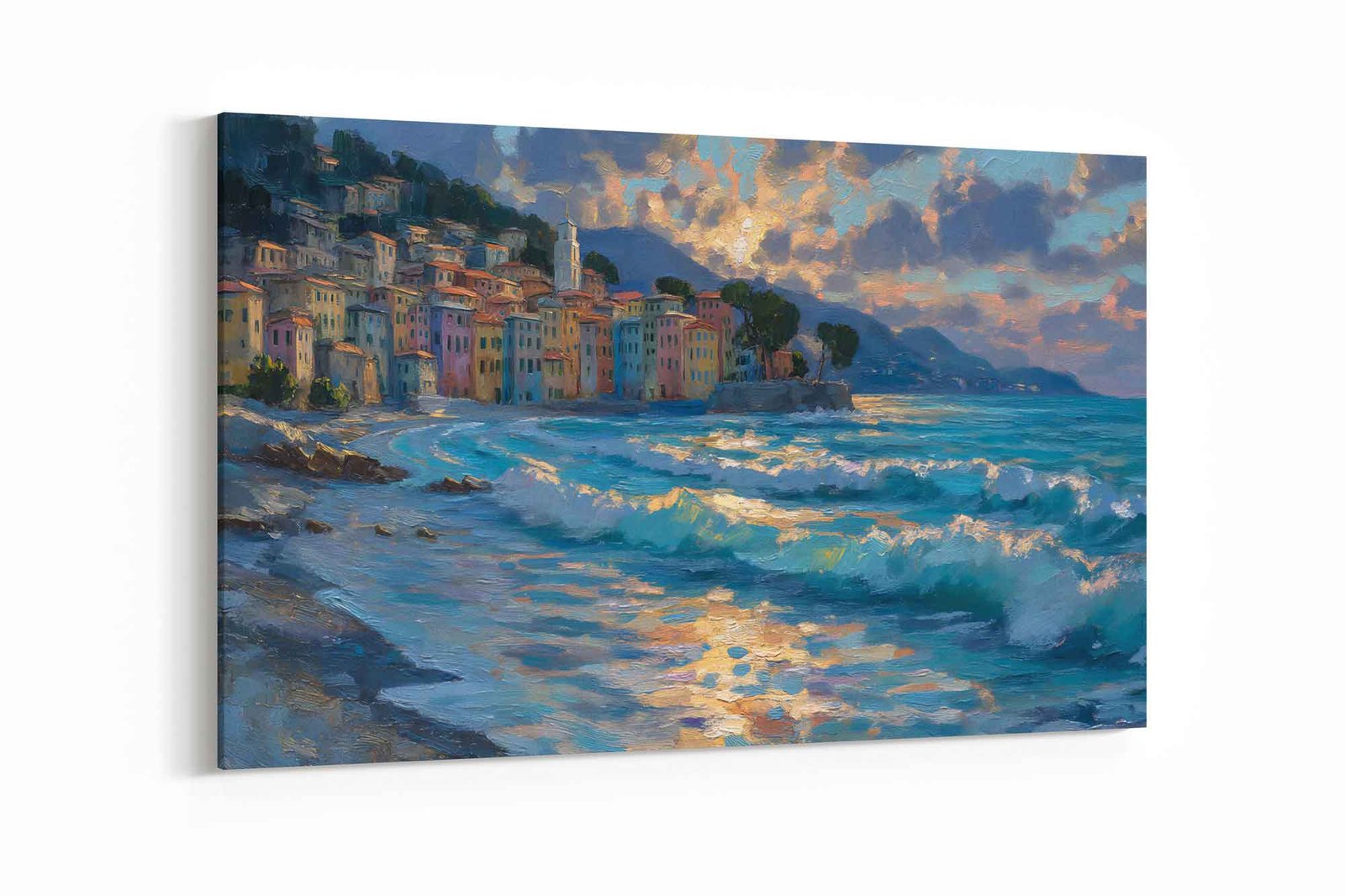 Experience the stunning visual and tactile richness of the impasto technique, where thick, expressive brushstrokes create a dynamic, textured town wall art effect. You can almost feel the sun on the vibrant buildings and the cool spray of the Mediterranean seascape artwork. The lively palette brings this scene to life, showcasing the colorful architecture and the sparkling, ever-moving ocean.