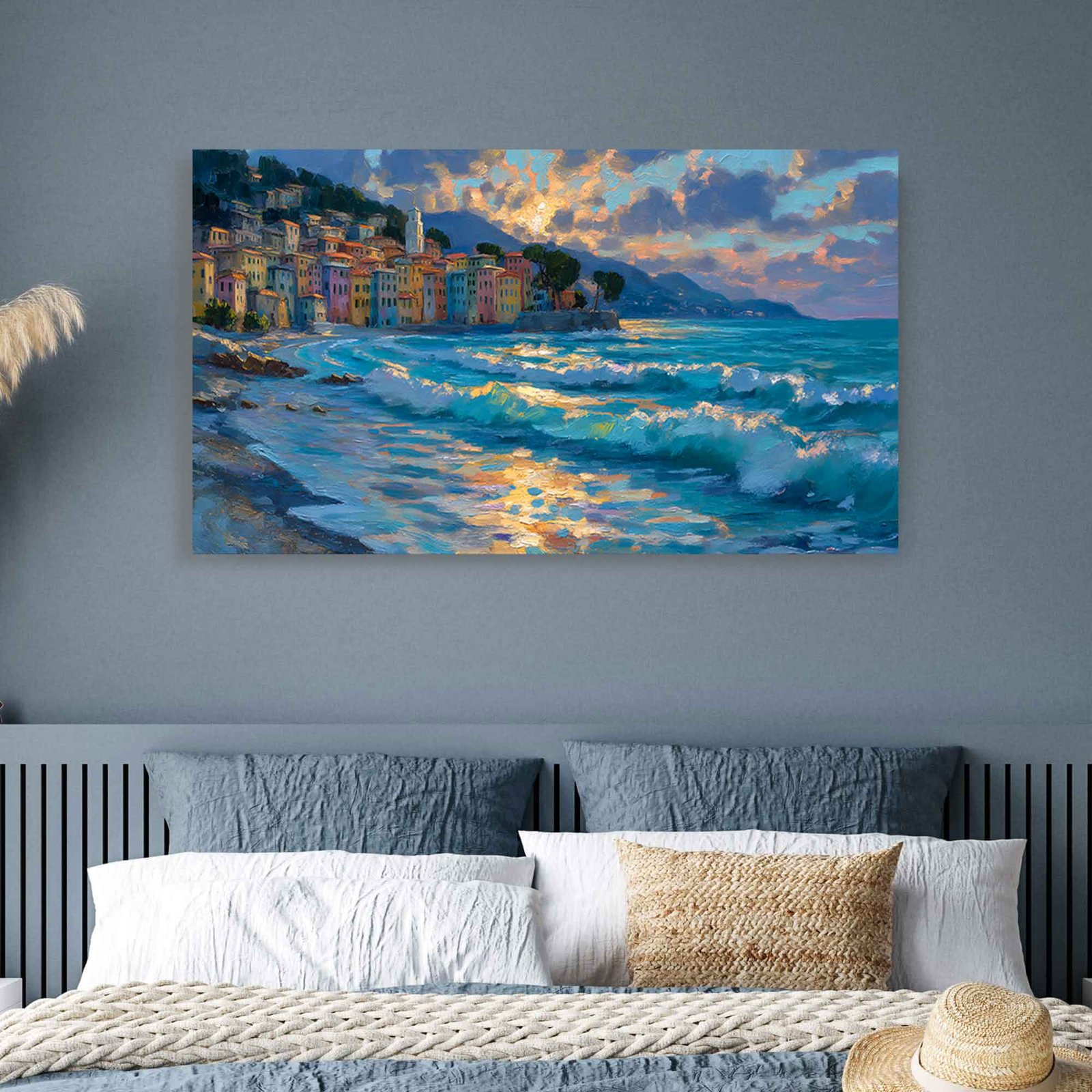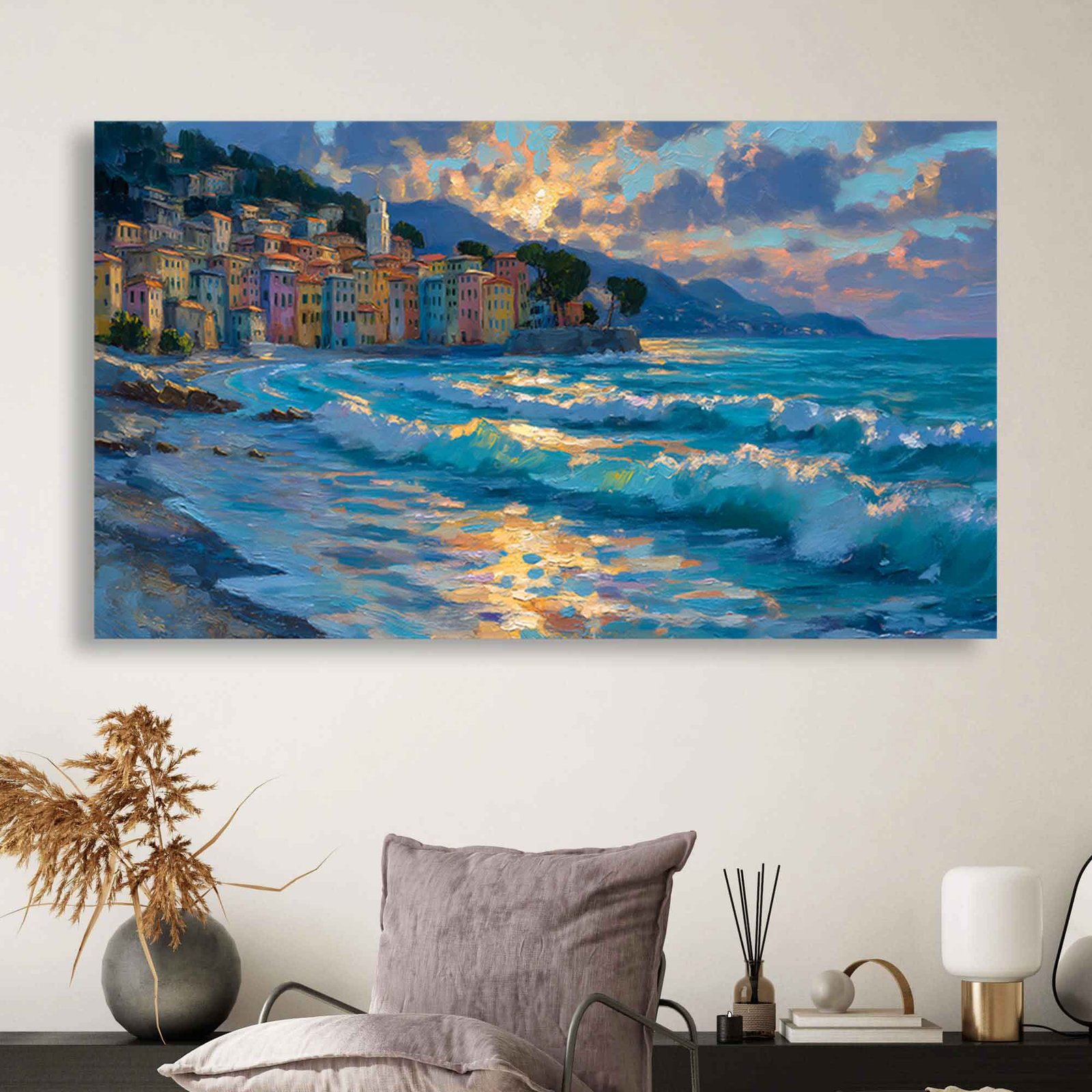 This Impasto Italian Coastal Village Canvas Print is more than just decor; it’s a sensory journey to the heart of Europe. Its vibrant energy and charming details make it the perfect focal point for a living room, a cheerful addition to a kitchen or dining area, or an inspiring piece for an office. It beautifully complements both modern and traditional interiors, adding character and warmth.