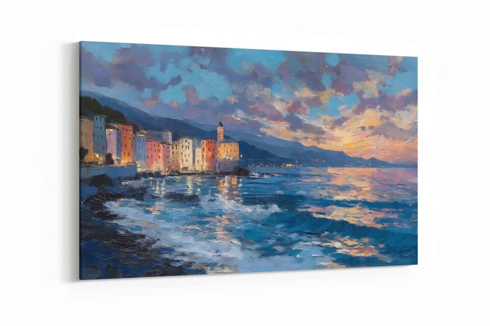 Witness the delicate transition from dusk to night as a Twilight Italian Coastal Town begins to sparkle with soft lights, reflecting gently on the calm sea. The glowing seascape night painting captures the ethereal beauty of the moon or distant light source casting a shimmering path across the water, inviting peaceful reflection. The quaint buildings of the romantic ocean village stand in quiet harmony with the natural beauty around them, creating a scene of profound calm and timeless romance.