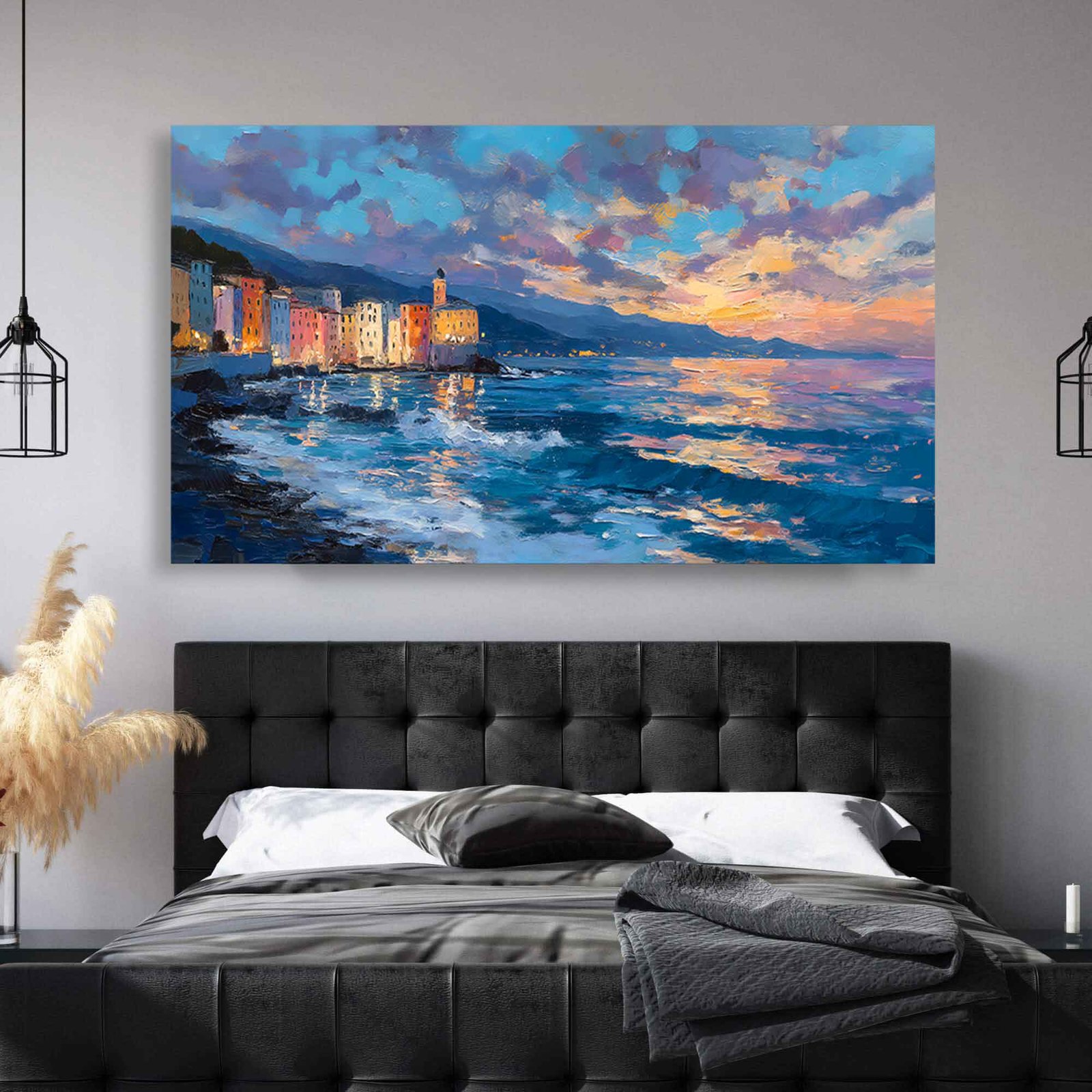 This captivating artwork transports you to a picturesque village nestled along the Mediterranean coast, where the magic of twilight unfolds over the tranquil ocean.
