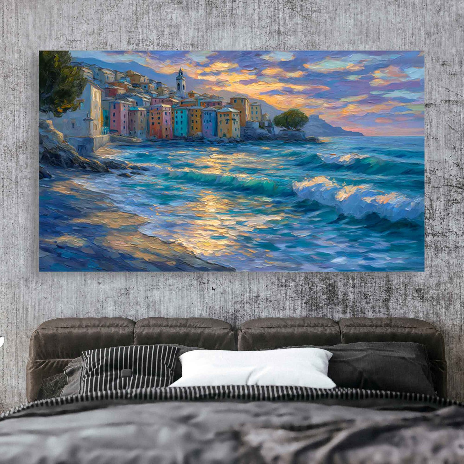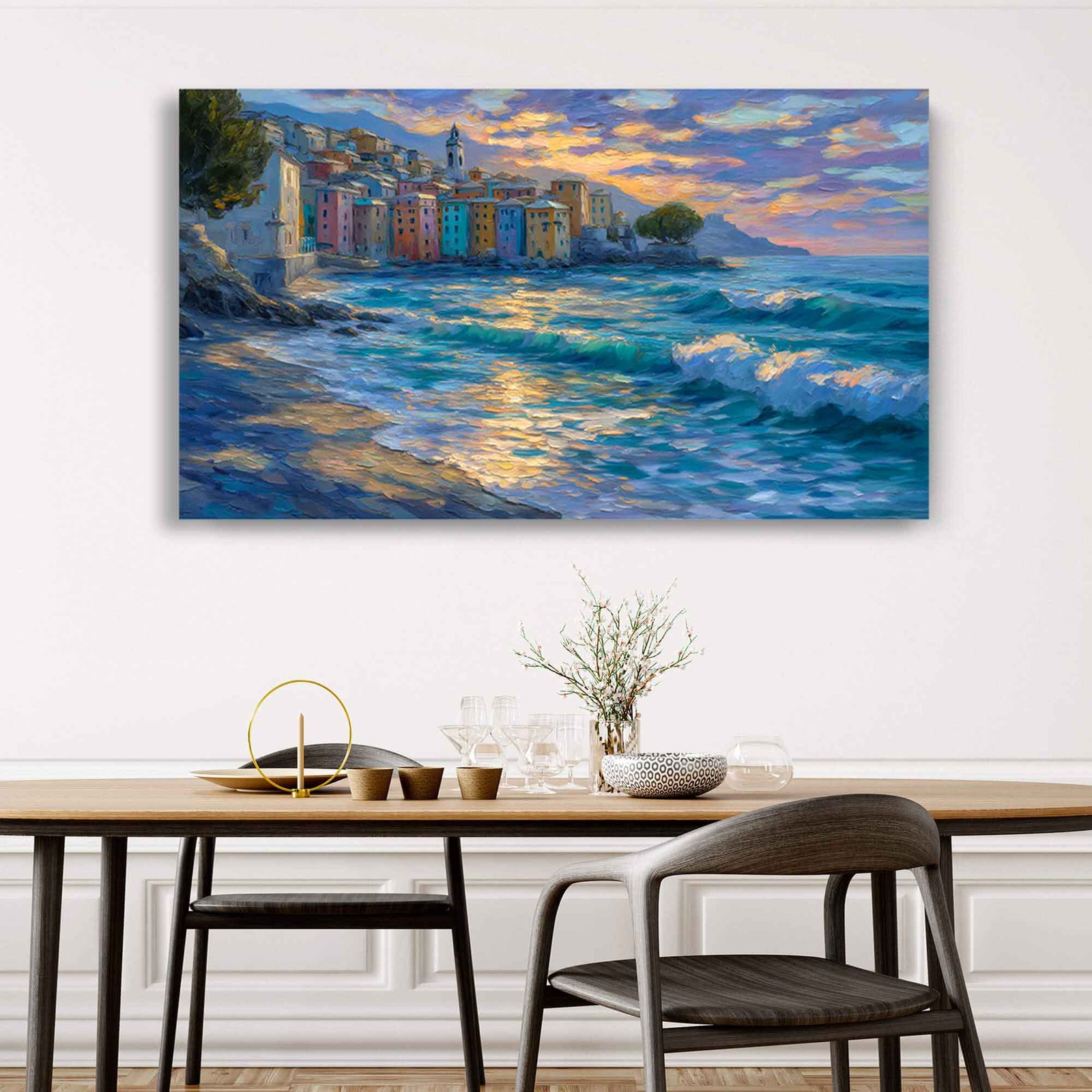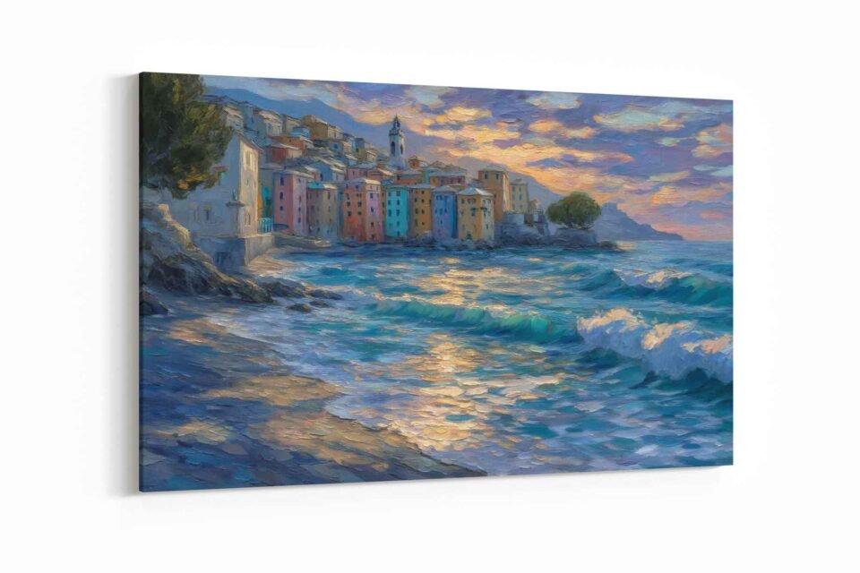 This exquisite canvas art print is a stunning reproduction of a painting that beautifully conveys movement and a rich palette. The “Sunny Coastal Town” features a picturesque village, its charming architecture painted in a spectrum of cheerful colours, set against a backdrop of azure skies and an active, sparkling ocean. The spirited ocean waves, rendered with captivating detail, add a sense of dynamic energy to the tranquil beauty of the coastal scene. Every element, from the sun-kissed cliffs to the playful surf, contributes to an atmosphere of invigorating beauty and joyful escape.
