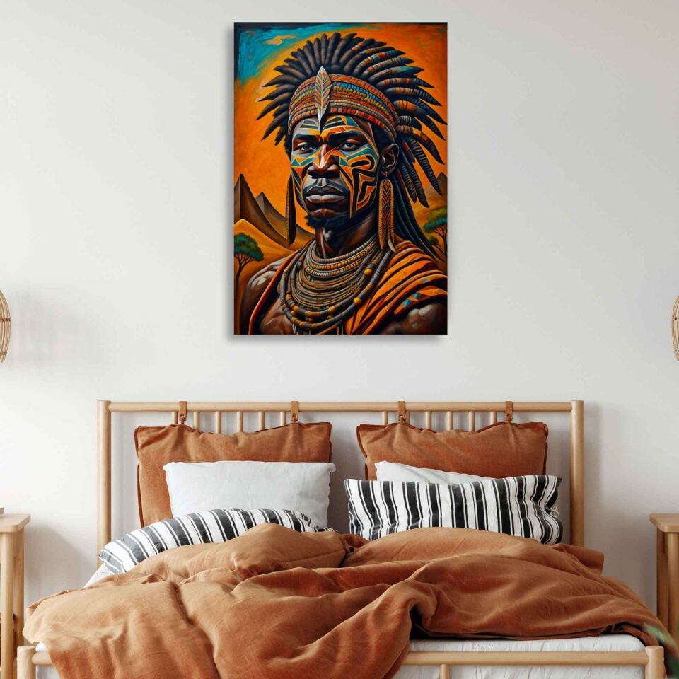 The portrayal of the warrior exudes a sense of courage and pride, reflecting the rich cultural heritage of African tribes. The fusion of primitive abstraction with ethnic motives creates a unique and compelling piece that celebrates the resilience and spirit of the warrior.