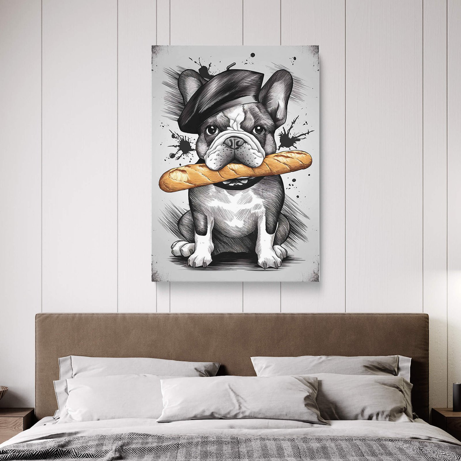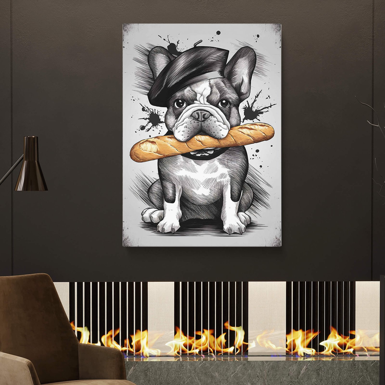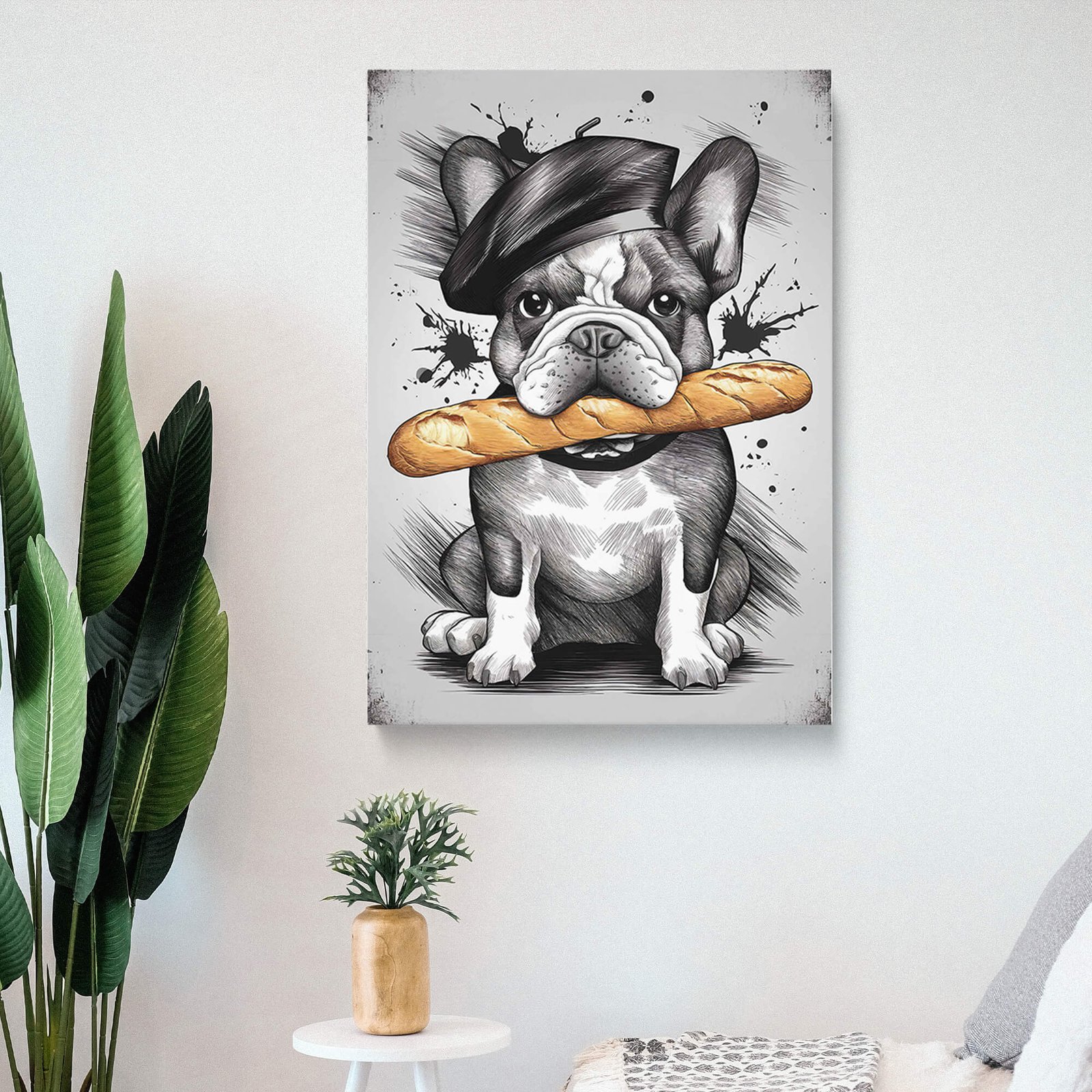 French Bulldog with Beret and Baguette Canvas Print – Frenchie Dog Wall Art