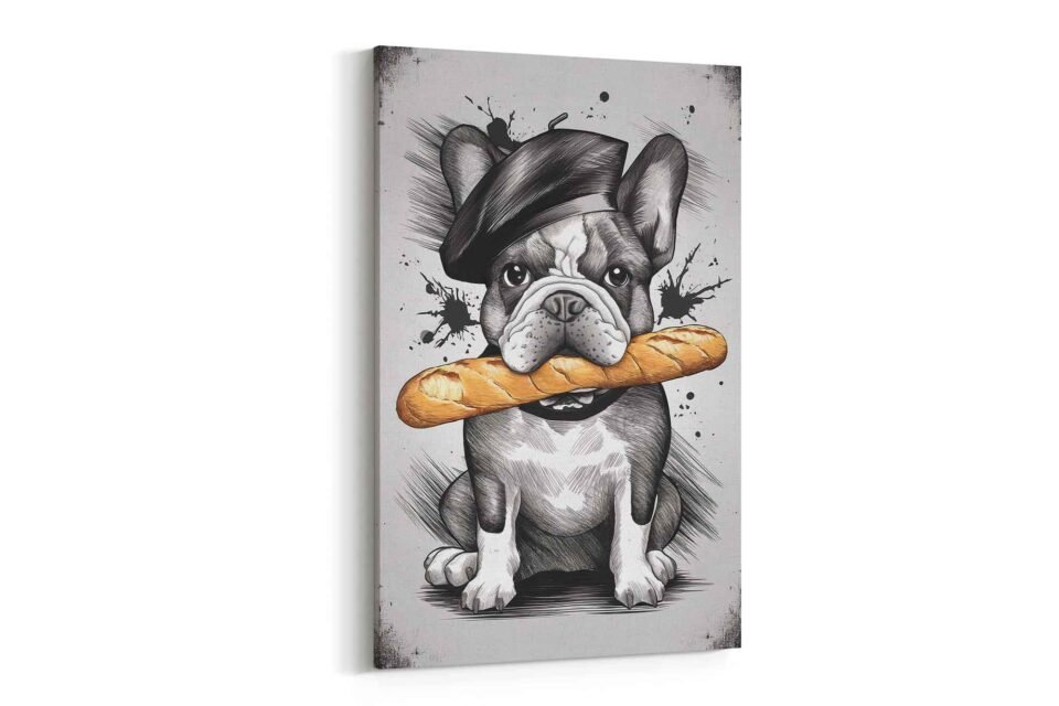 This charming canvas print features a dapper French Bulldog, confidently sporting a classic French beret and holding a freshly baked baguette. The artwork is rendered in a vibrant, contemporary style with bold lines and a pop art aesthetic that makes the image truly pop. This isn’t just a quirky picture; it’s a statement piece that sparks conversation and celebrates the unique character of one of the world’s most beloved breeds. The clever and unexpected juxtaposition of a dog in human attire, combined with a modern art style, makes this a truly one-of-a-kind piece. It’s perfect for adding a sense of humor and modern flair to any space that needs a unique focal point.