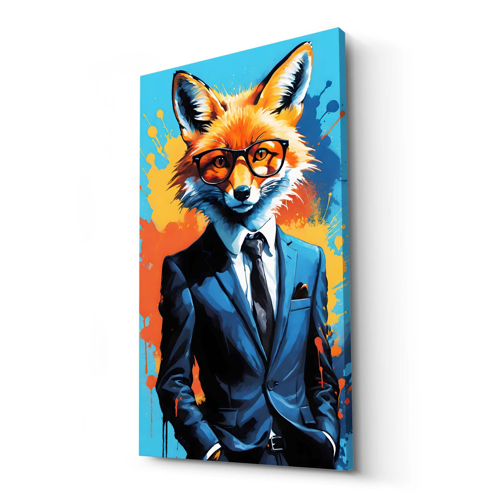 This striking canvas print features a dapper fox, impeccably dressed in a stylish suit and tie, a hilarious and charming twist on a classic animal portrait. The artwork is rendered in a vibrant, contemporary style with bold colors, clean lines, and a dynamic aesthetic that makes the image truly pop. This isn’t just a funny picture; it’s a statement piece that sparks conversation and showcases a playful personality. The clever and unexpected juxtaposition of a wild animal in human attire, combined with a modern art style, makes this a truly one-of-a-kind piece. It’s perfect for adding a sense of humor and modern flair to any space that needs a unique focal point.