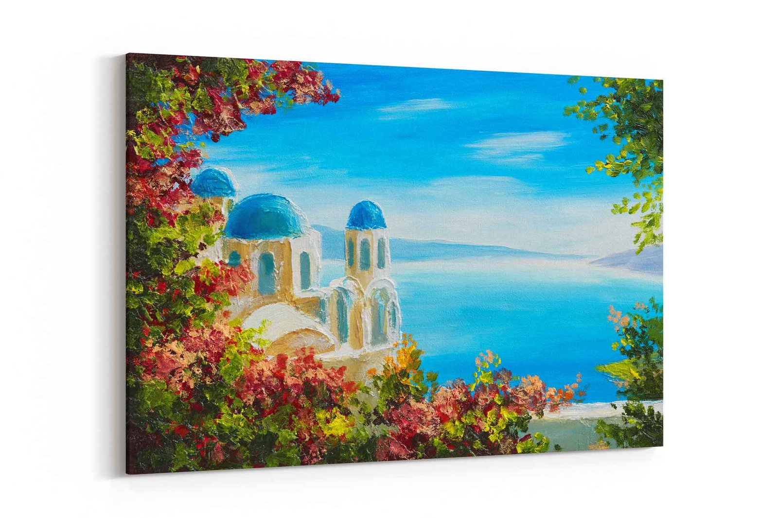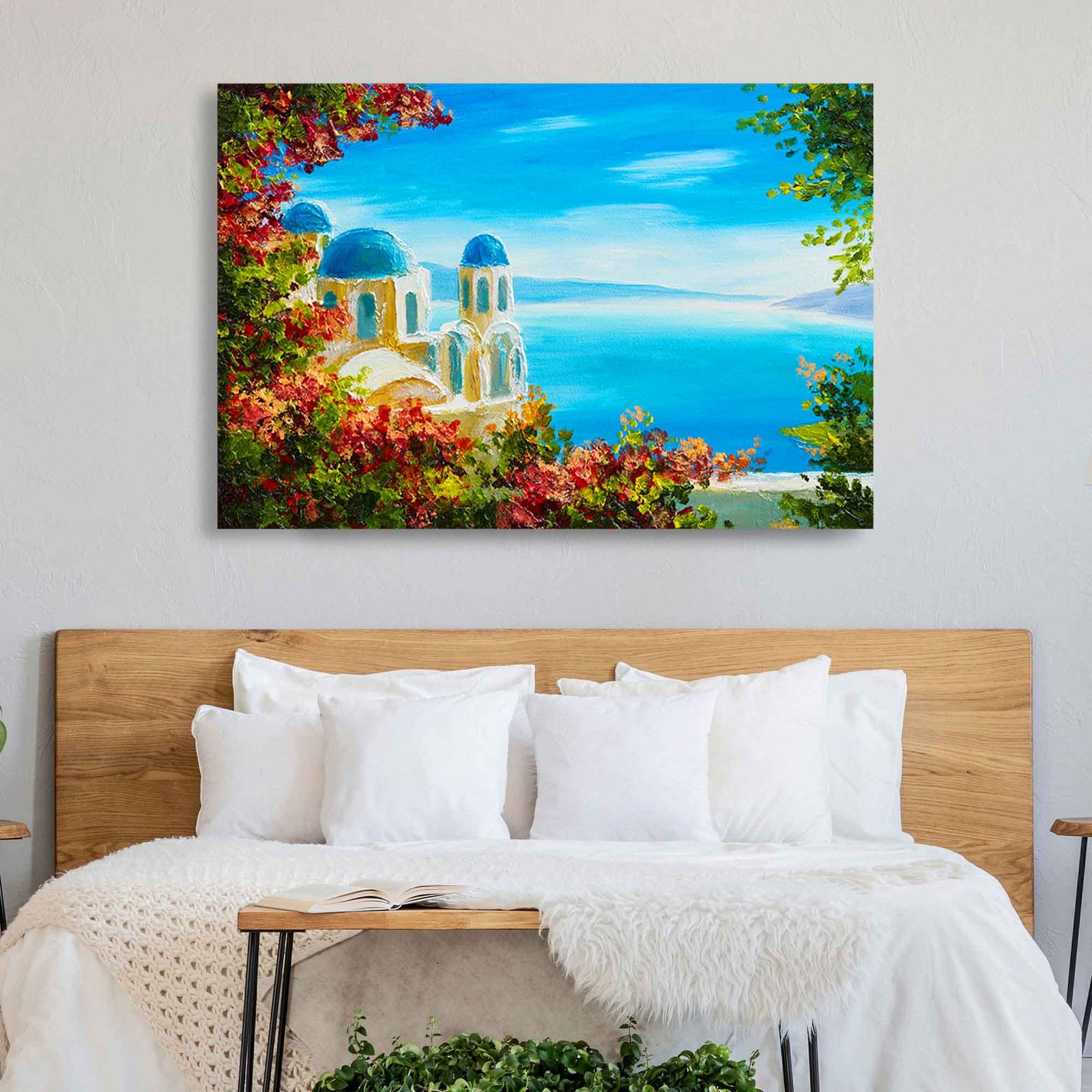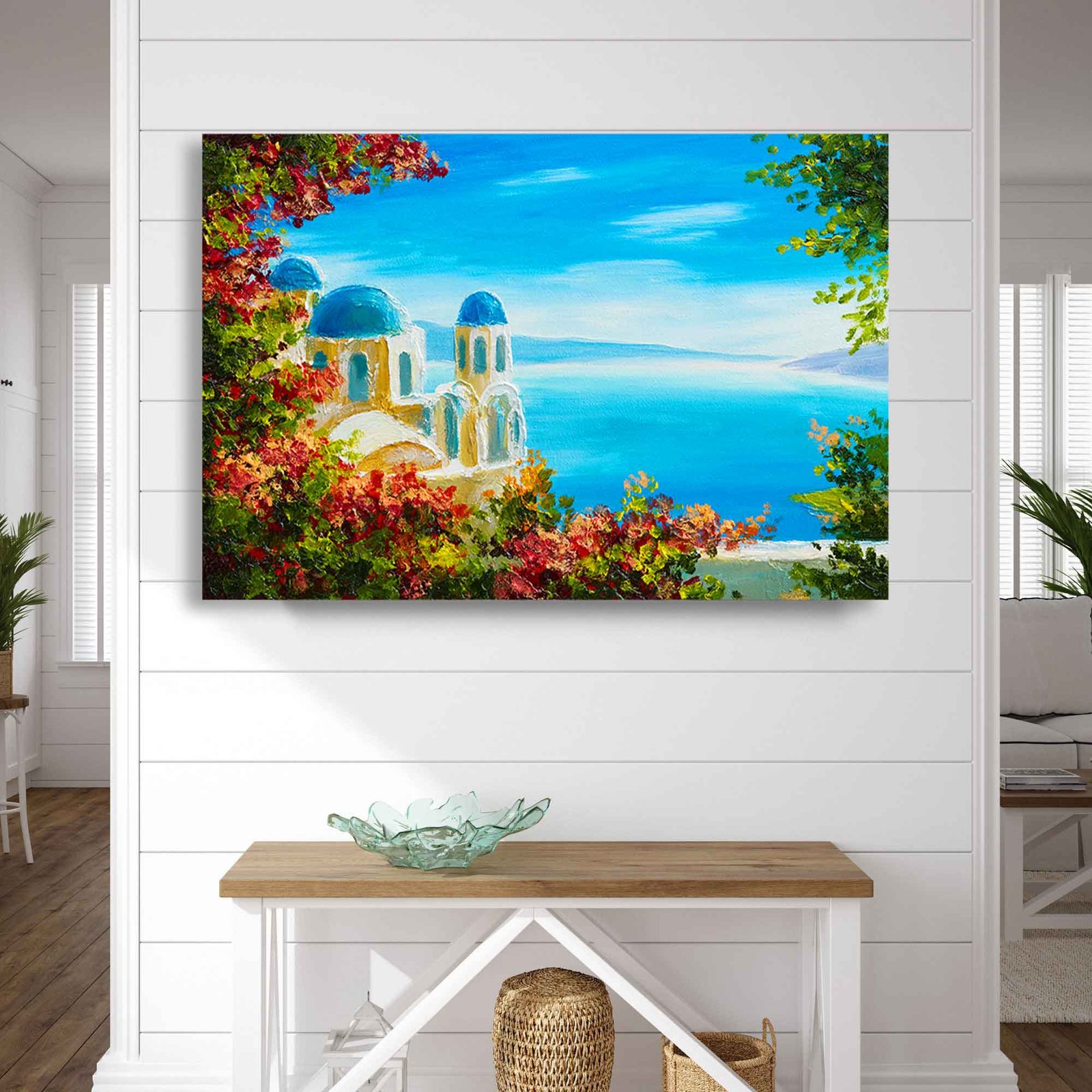 Bring the charm of the Mediterranean into your home with this Santorini Greece landscape canvas wall art. Featuring vibrant blue domes, lush florals, and a serene ocean view โ€“ perfect for modern, coastal, or boho dรฉcor.ย