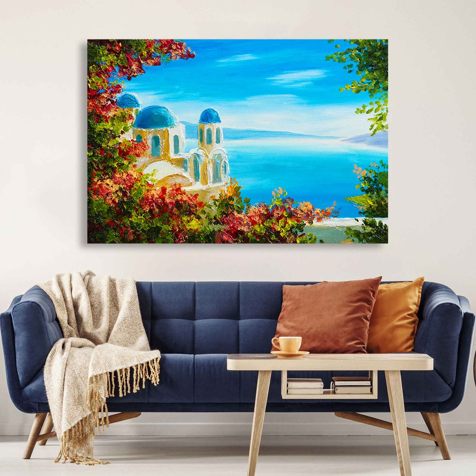 Santorini Seaside Wall Art โ€“ Greece Mediterranean Coastal Landscape Canvas Print with Blue Domes and Ocean View.