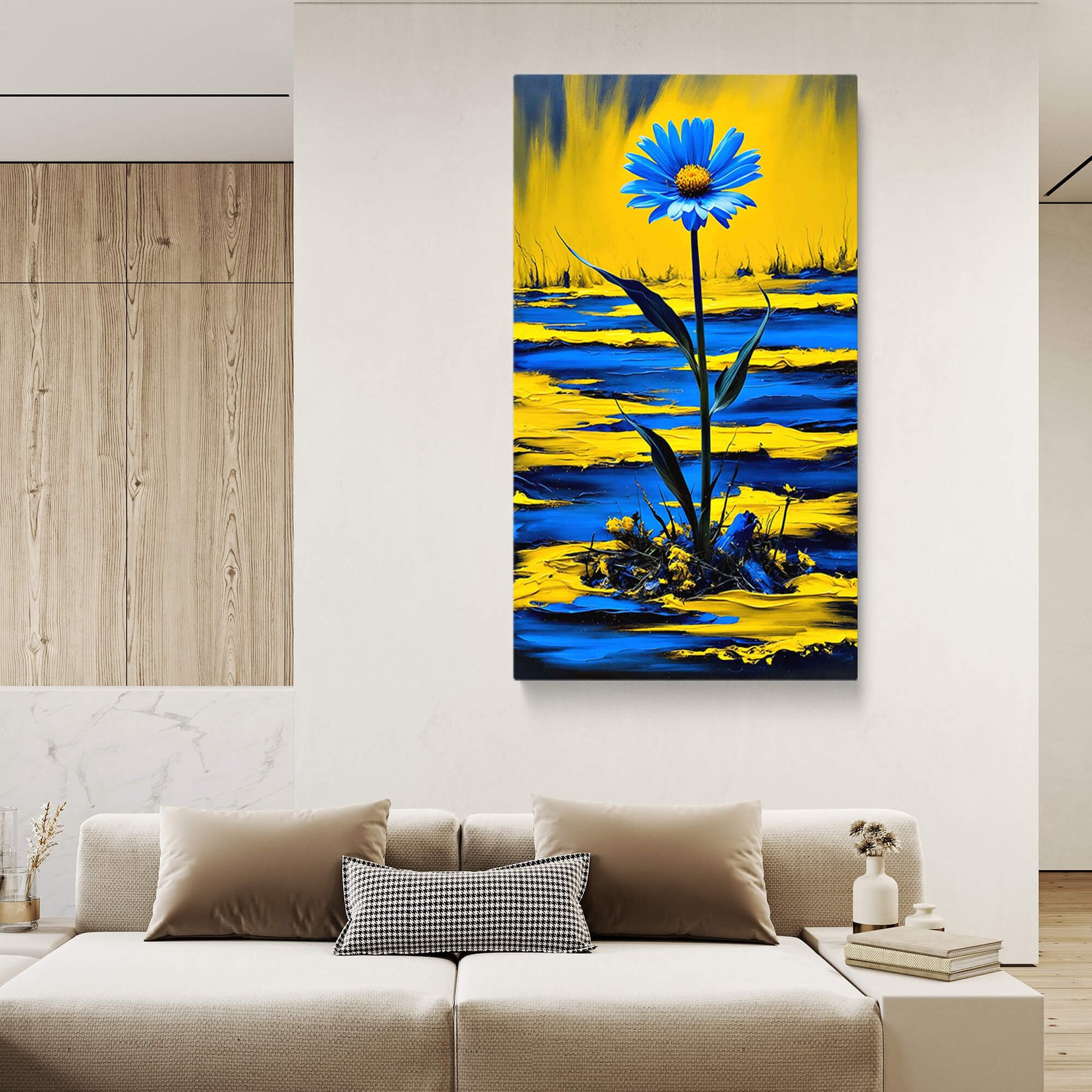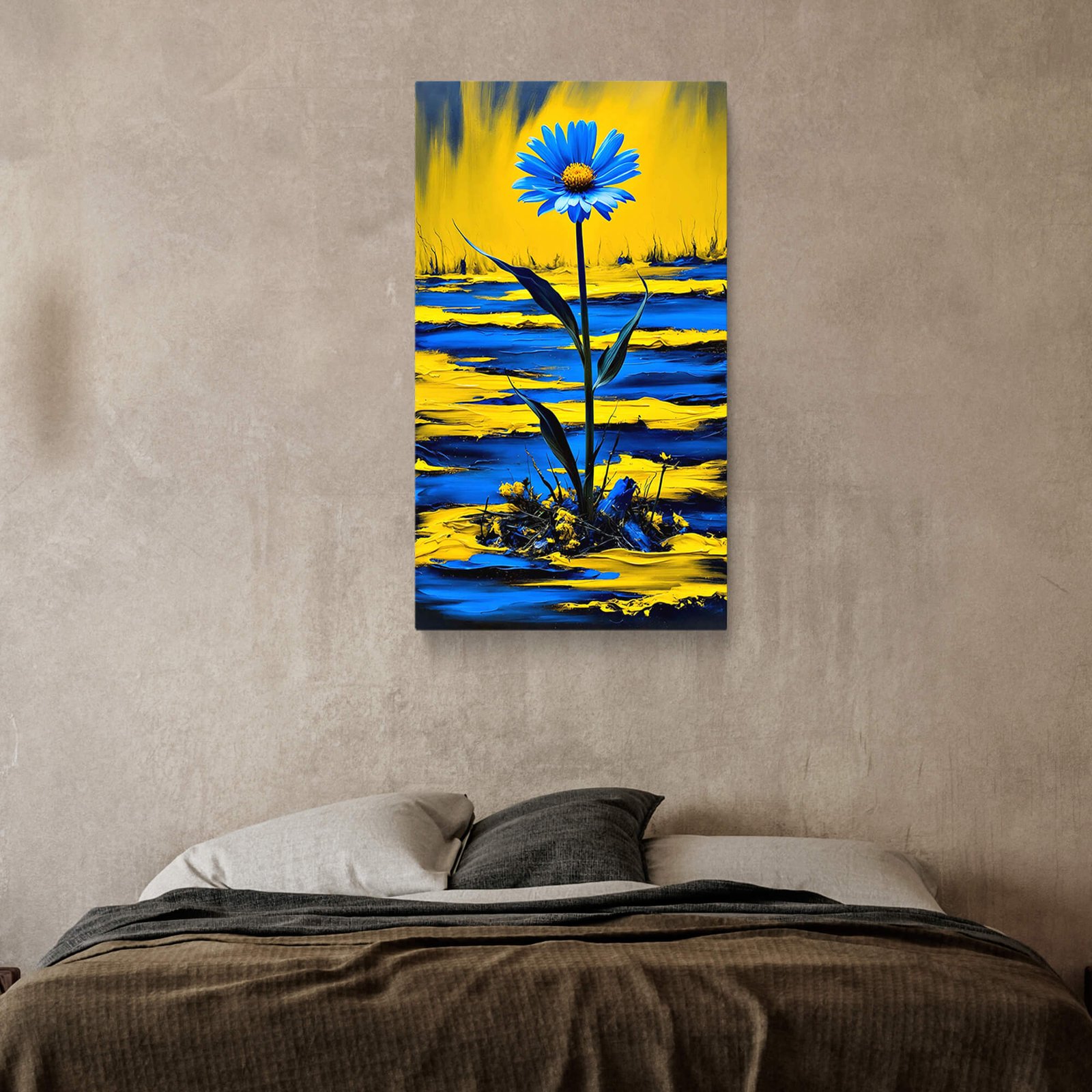 Make an unforgettable statement with this Bold Yellow and Blue Floral Canvas Print. A vibrant explosion of colour and texture, this artwork features a singular, striking flower rising from a rich, abstract landscape of contrasting yellow and blue tones.