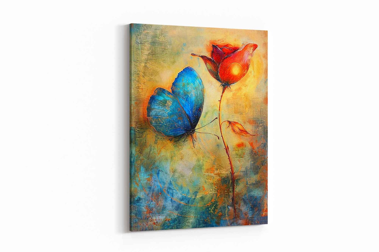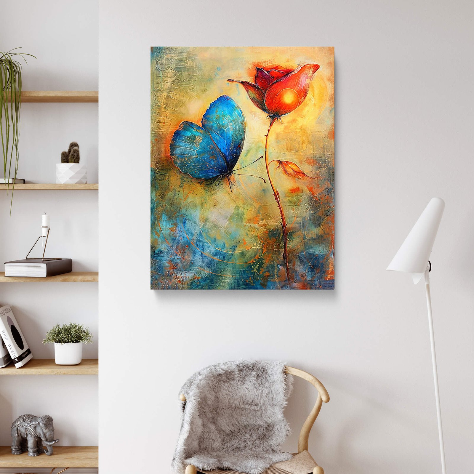 Mixed Impasto – Vibrant Blue and Orange Abstract Painting on Canvas Print, Butterfly and Rose Wall Decor, Warm Textured Floral Print